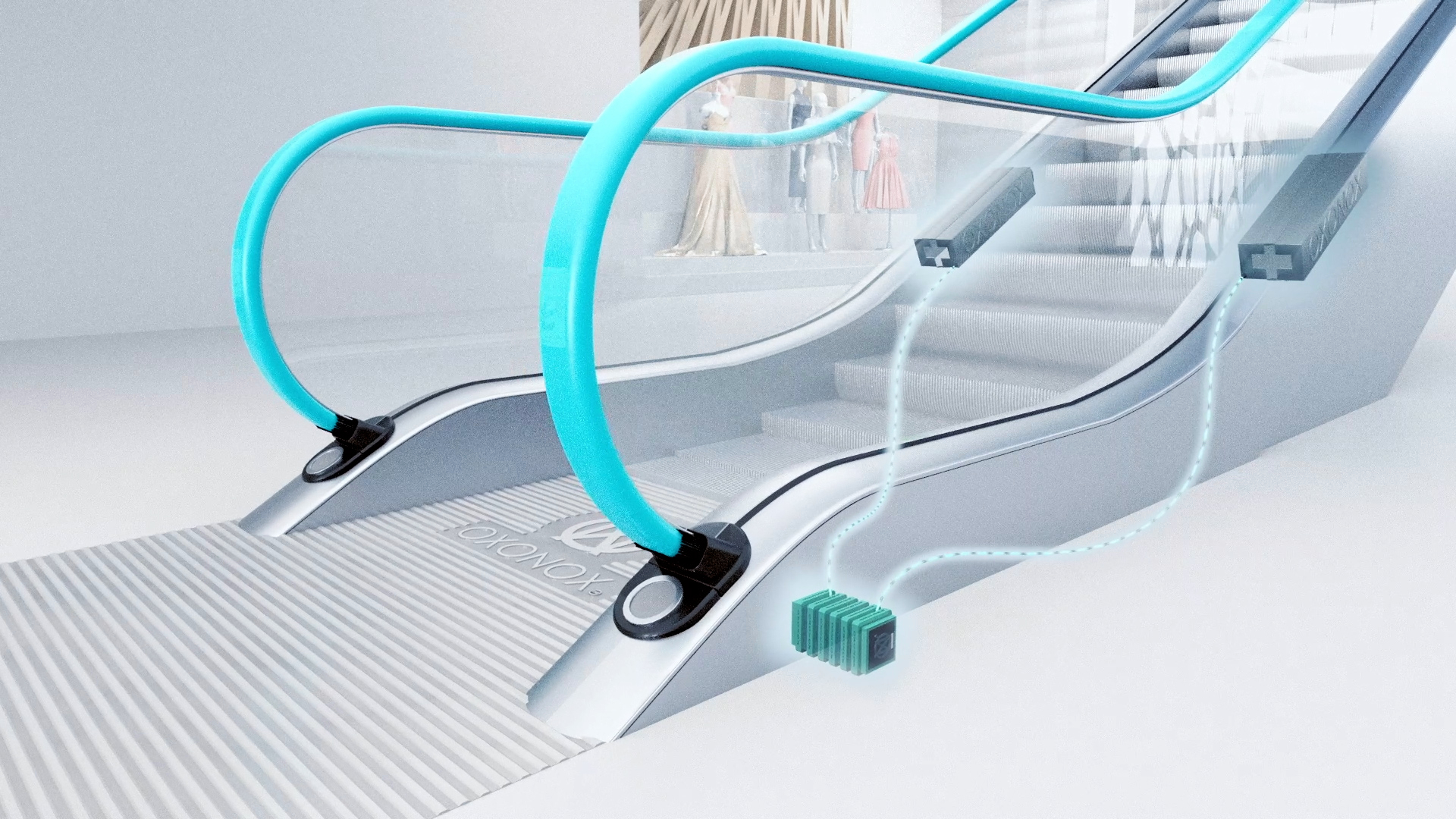A device inside the escalator mechanism works by extracting oxygen and nitrogen from the air to produce plasma particles which are applied onto the handrail to kill and prevent 99.9% of hidden viruses and bacterial pathogens.