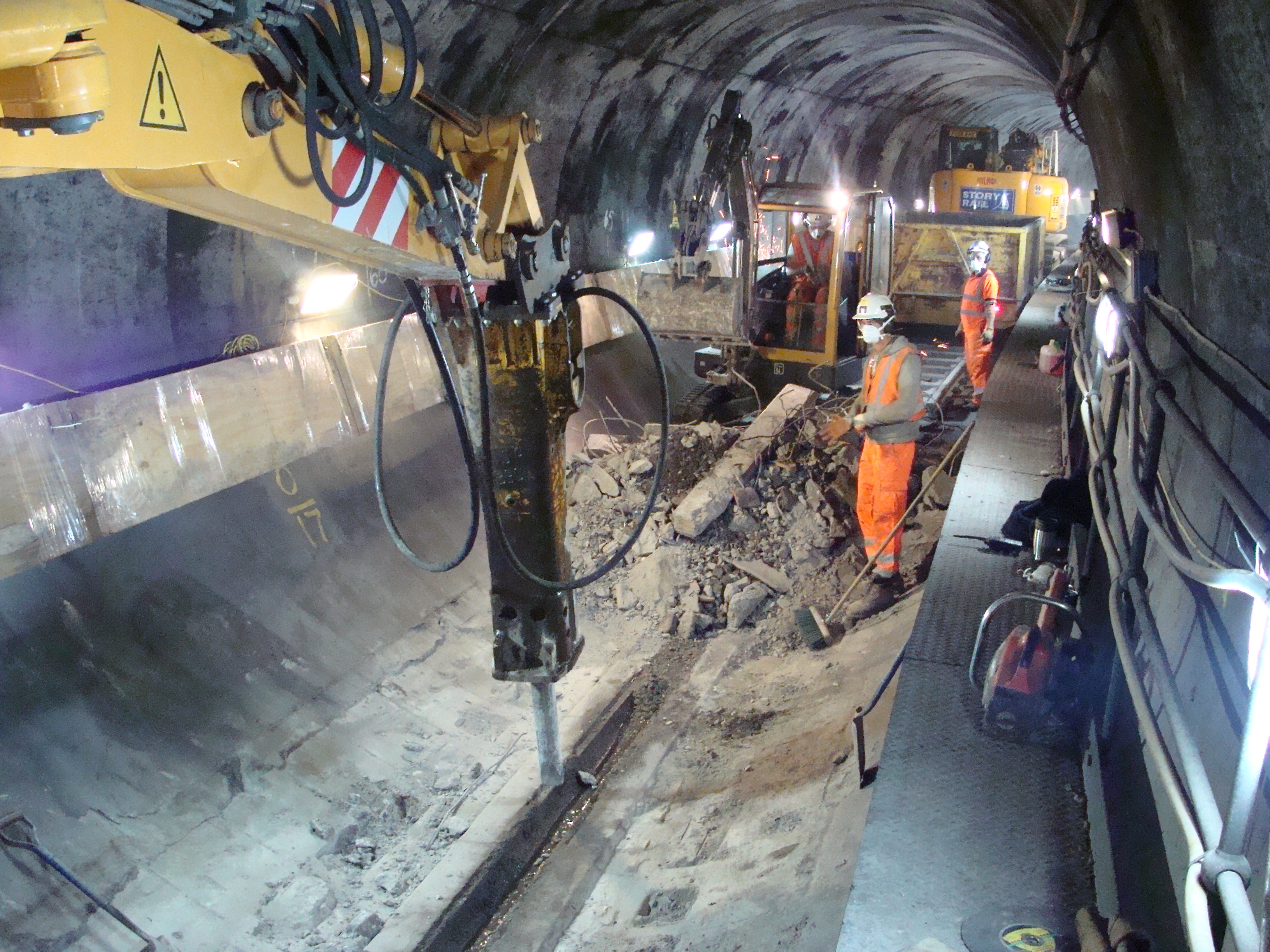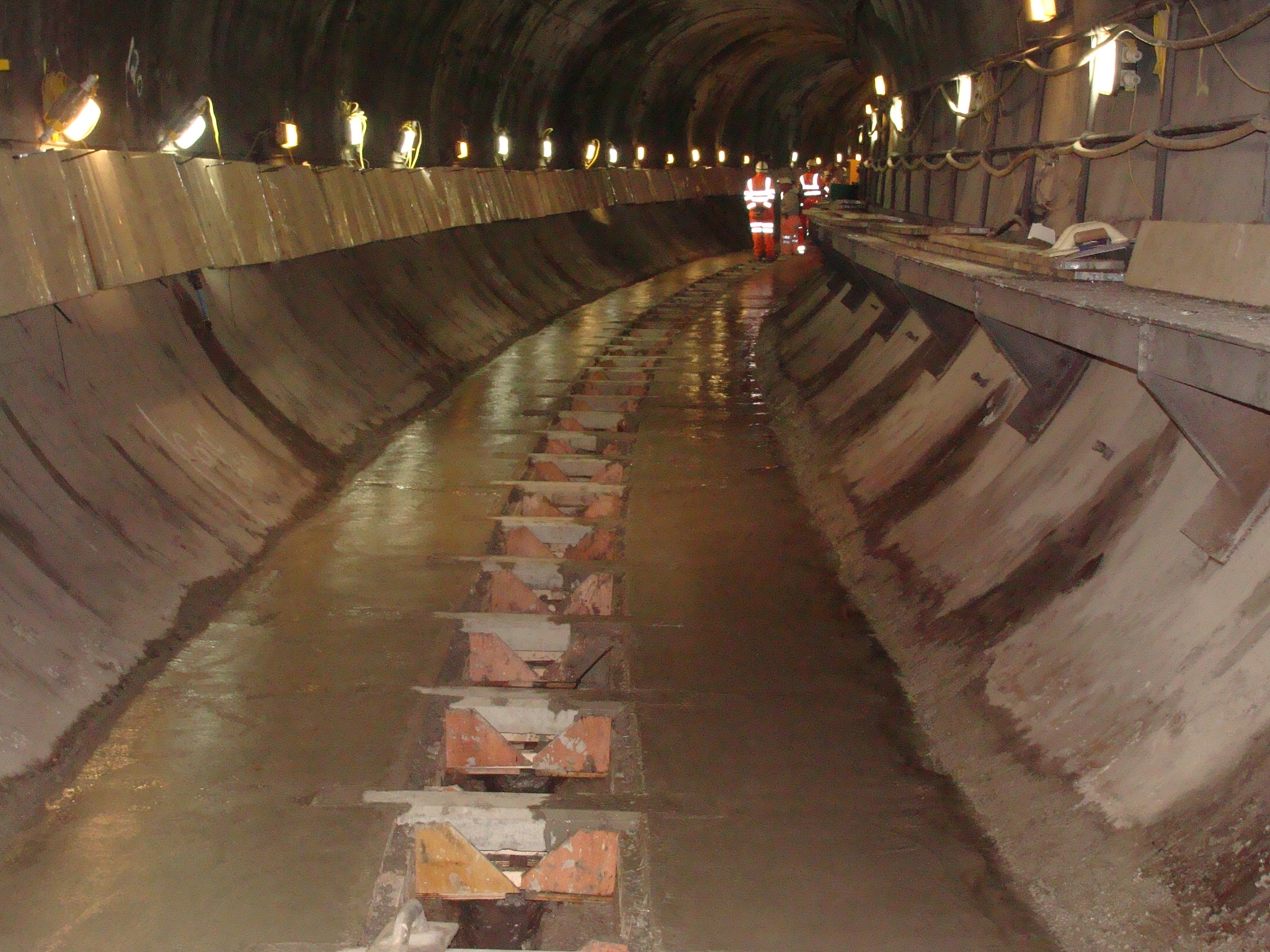 • Removing the old rails • Breaking up the old concrete slab • Laying shuttering and reinforcing bars to form the new slab • Pouring the concrete into the shuttering and smoothing it over • Drilling bolt holes in the concrete and fixing base plates in position • Laying the new rail tracks on the base plates • Reinstating the electric third rail and various communication and power cables • Clearing away the work debris