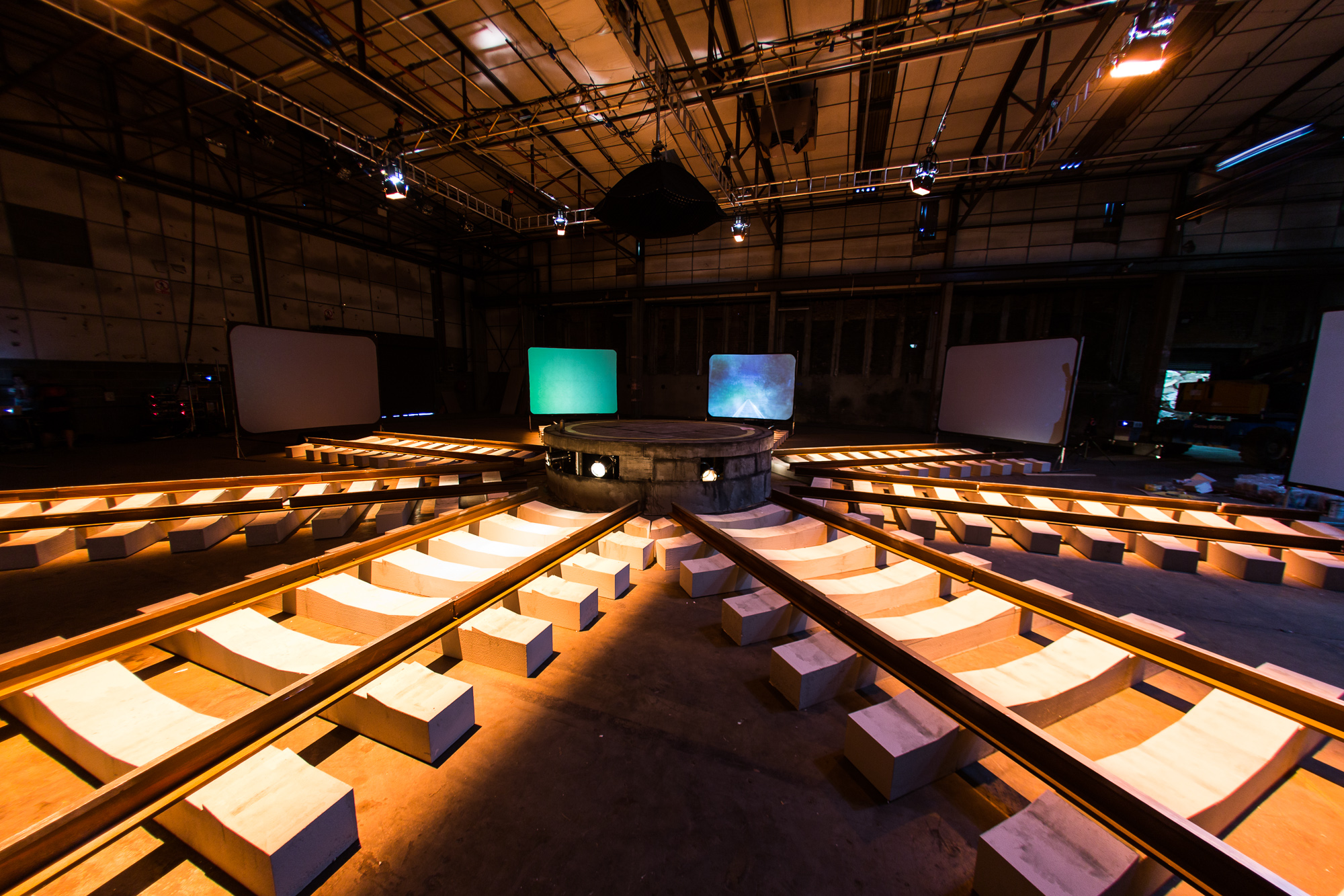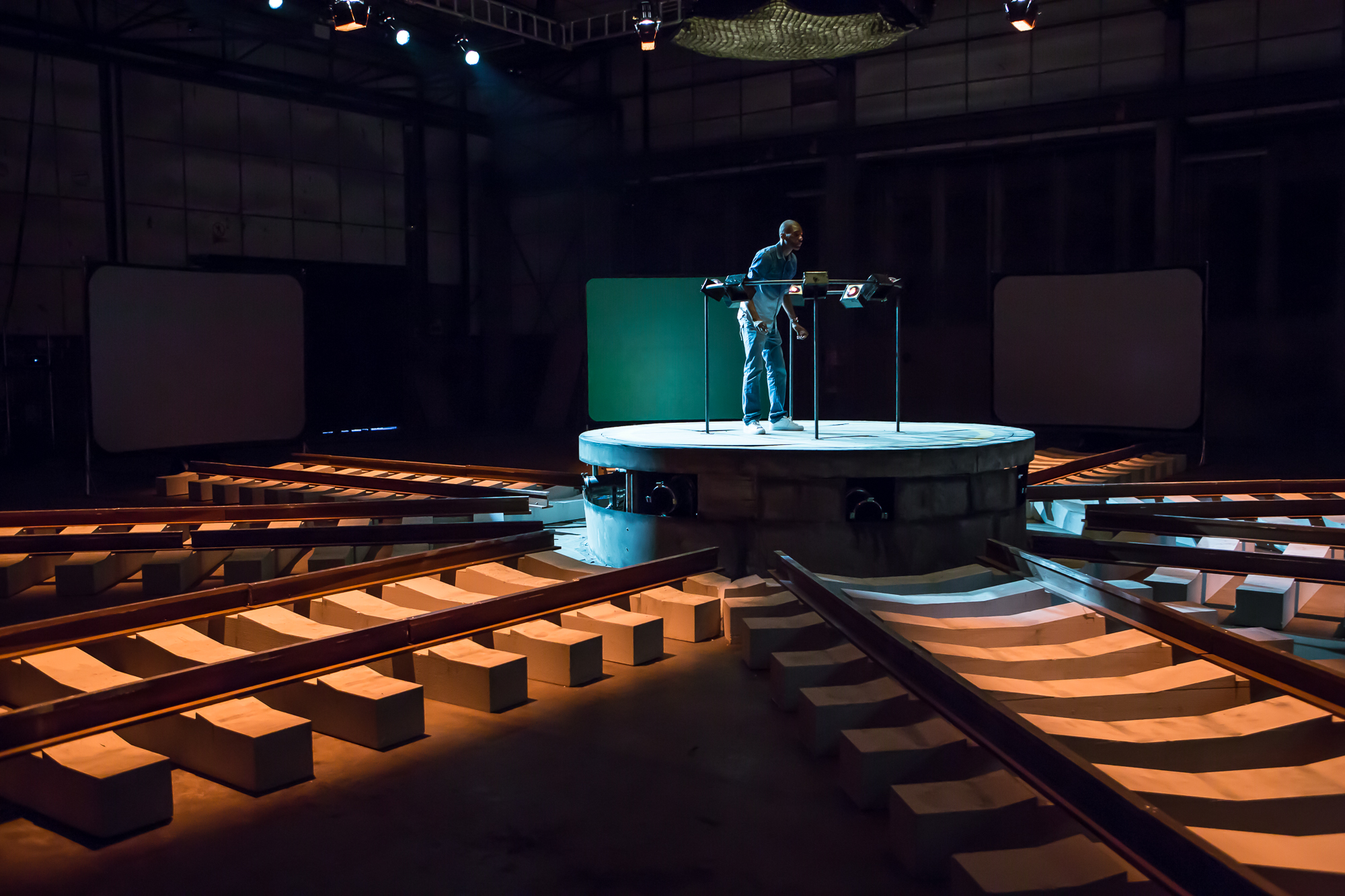 In this instance of course, it’s not a real train. The artists stand in a warehouse where a mocked-up railway with a ‘spoke’ of tracks has been built. Sound engineers have created a 360 degree surround-sound system to recreate the noise of an approaching train with other distracting noises such as wind and traffic.