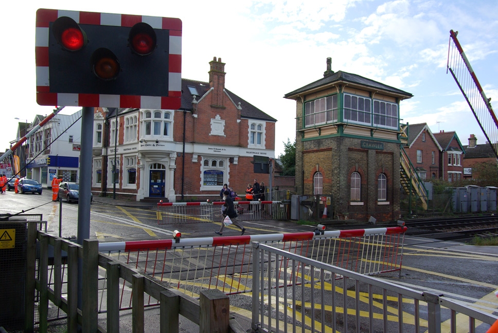 The incident took place on 14 November 2009 and shows a pedestrian walking back onto the Crawley High Street level crossing while the barriers were being lowered. She proceeded to stand in the middle of the tracks and continually encourage another person to jump over the barrier and cross. Fortunately the signaller saw the crossing was not clear and was able to hold the train at a red light further down the line until the person left the crossing. This incident caused delays to both train passengers and other crossing users and could have ended in tragedy.