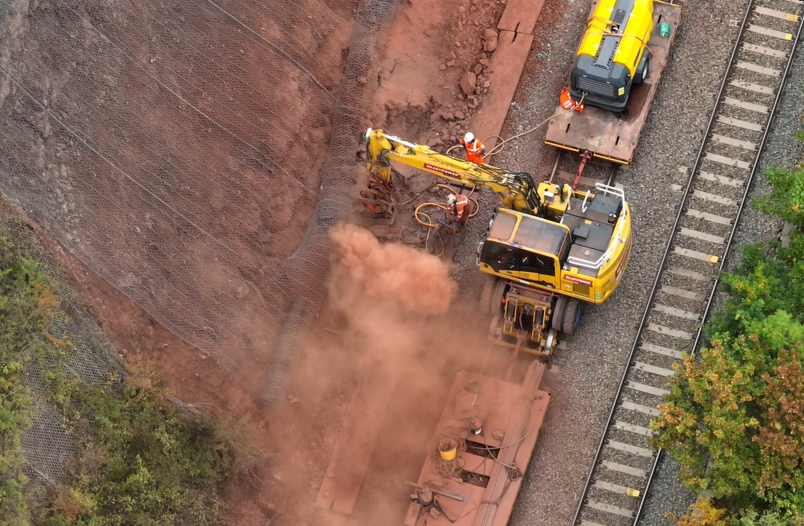 Teams will then begin to install an ‘active’ mesh system covering 19,500m2 secured by more than 5,000 rock bolts. This system will hold the cliff face in position and help to prevent landslips from damaging and subsequently closing the railway.
