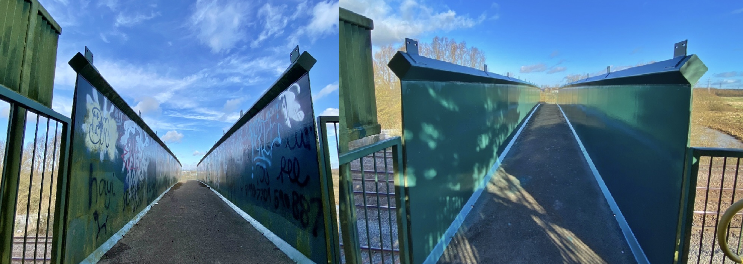 In the East Midlands, residents of Melton Mowbray are enjoying a more pleasant route over the railway following the removal of graffiti on a footbridge and unsightly tags have also been removed by Network Rail’s graffiti hit-squads across Manchester, Liverpool and Leeds; notably at Burley Park station and through Ashton Road Tunnel in Wigan.