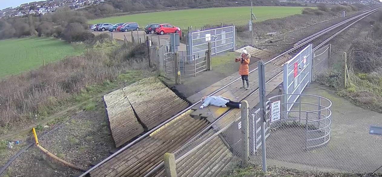 Network Rail is urging people to stay safe at level crossings after shocking CCTV footage showed a woman laying on railway tracks to pose for photographs