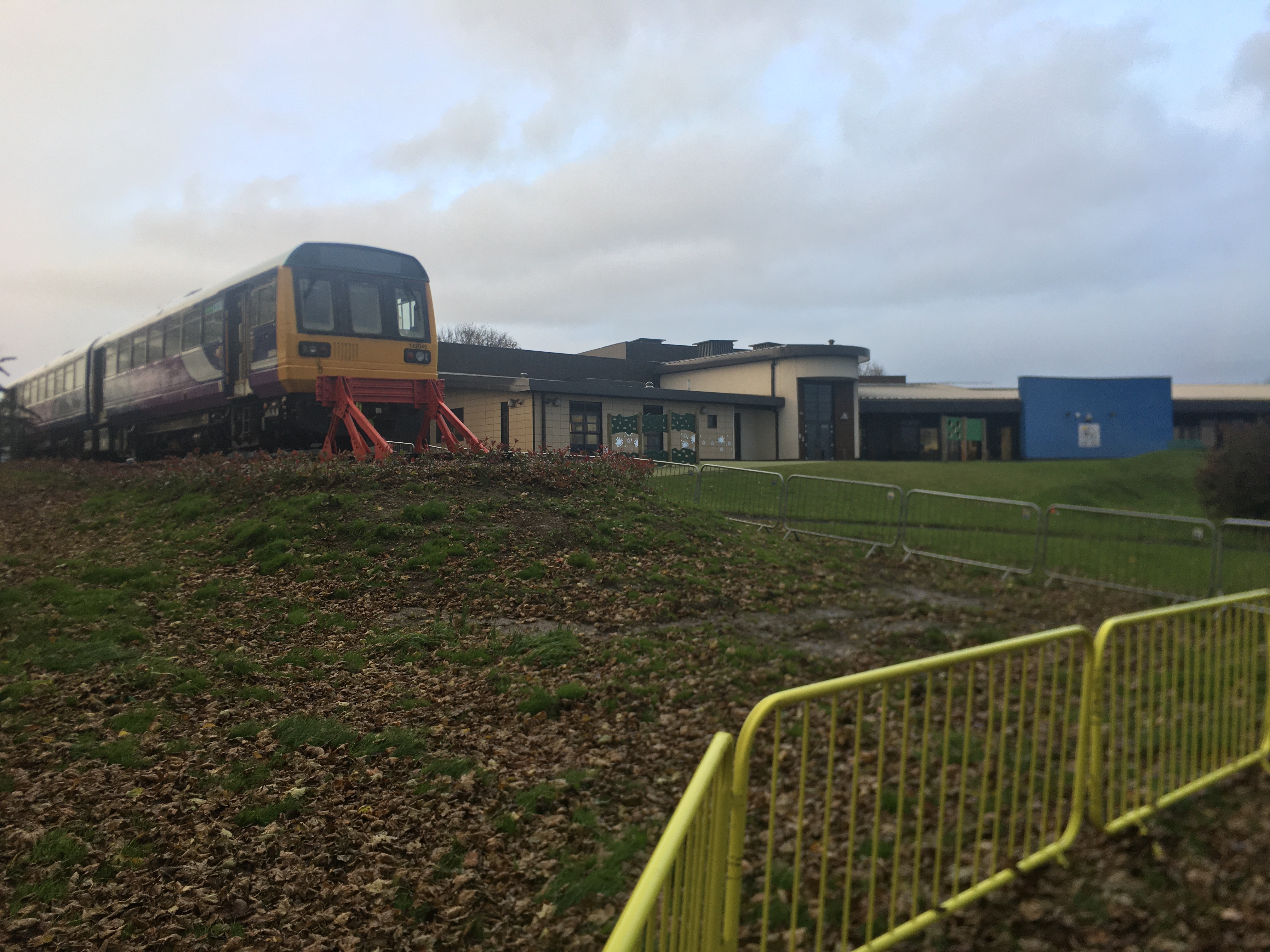 In preparation for the two carriages to be installed, Network Rail volunteers carried out work to install railway equipment such as track, as well as sleepers and ballast which support the rails, for the carriages to stand on. The carriages have now been transported to the school, rolled from a low loader vehicle across the car park and secured in place.