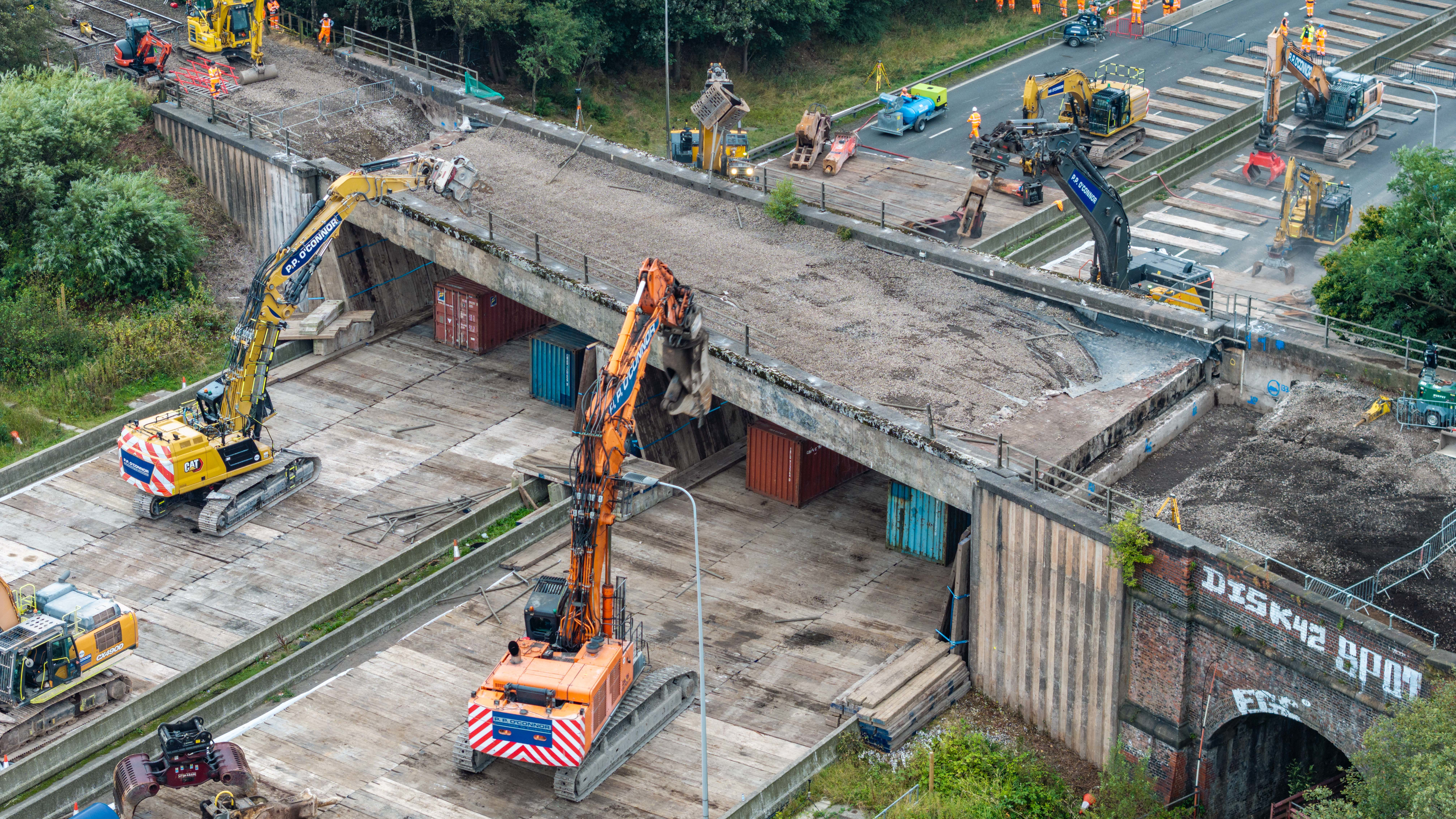 Drone photographs show the demolition excavators carefully removing the bridge on the deserted motorway.