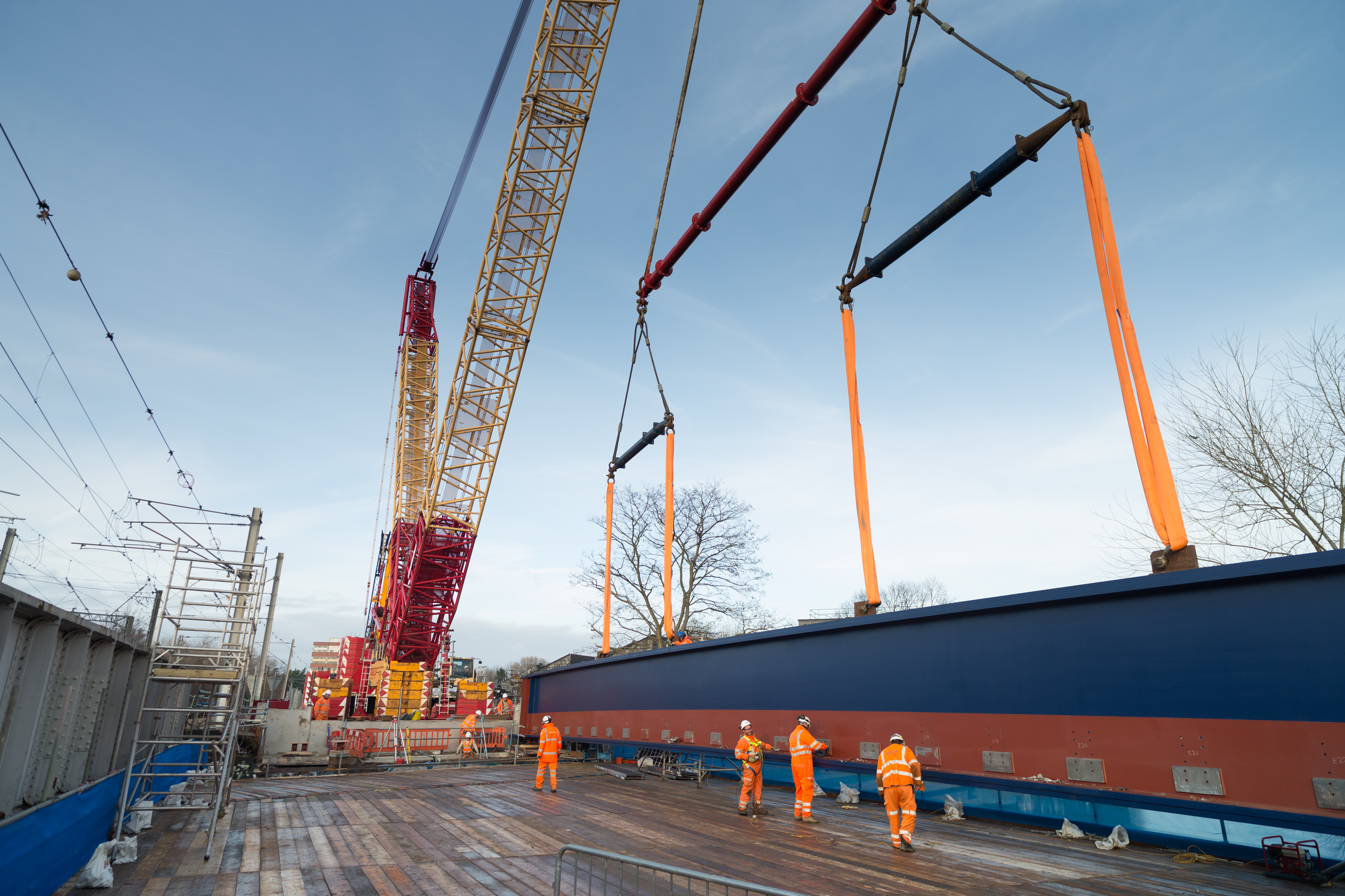 In one of its first major milestones, the project successfully lifted in a 400 tonne bridge last weekend. This included lifting two 40 metre long girders, weighing 138 tonne, over the adjacent line which was closed to passenger services. The operation was overseen by Network Rail and contractors VolkerFitzpatrick, and involved using a 600 tonne crawler crane to lift sections of the bridge into position.