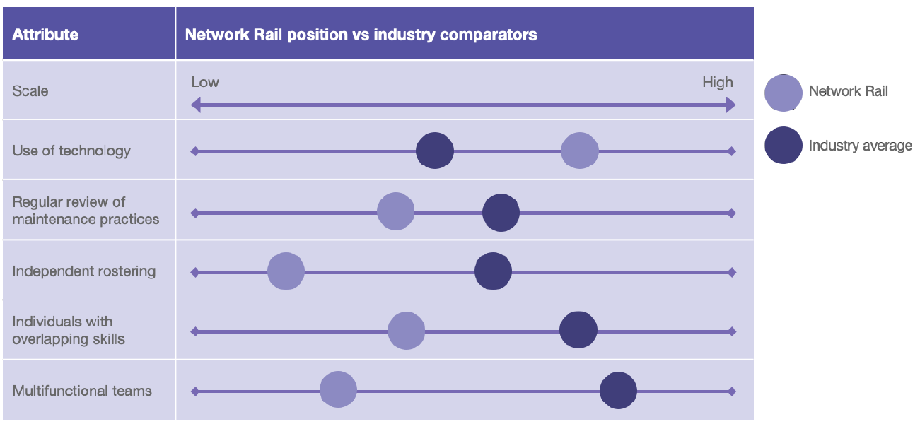 The study found that Network Rail lagged behind other industries – such as water, aviation, energy and roads – especially in the way it deploys its people. Specifically, the report highlighted that improvements could be made, and major efficiencies unlocked, by: