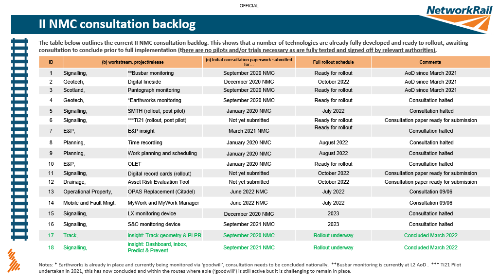 While the study asserts that Network Rail has made significant advances in its use of technology, the organisation believes that further improvements are achievable as the deployment of such technology has been slow. The table below illustrates how almost a dozen key technological improvements have been blocked by the RMT for over two years.