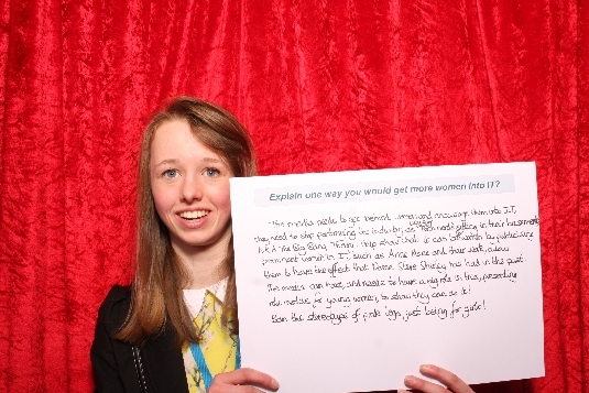 Zoe's Photobooth message: The media needs to get behind women and encourage them into IT, they need to stop portraying the industry as being for tech nerds sitting in their basements, A.K.A The Big Bang Theory. Help how that it can be for women by publicising prominent women in IT, such as Anne Marie and their work, allow them to have the effect that Dame Steve Shirley has had in the past. The media can have, and needs to have a big role in this, presenting role models for young women, to show they can do it! Ban the stereotype of pink lego just being for girls!