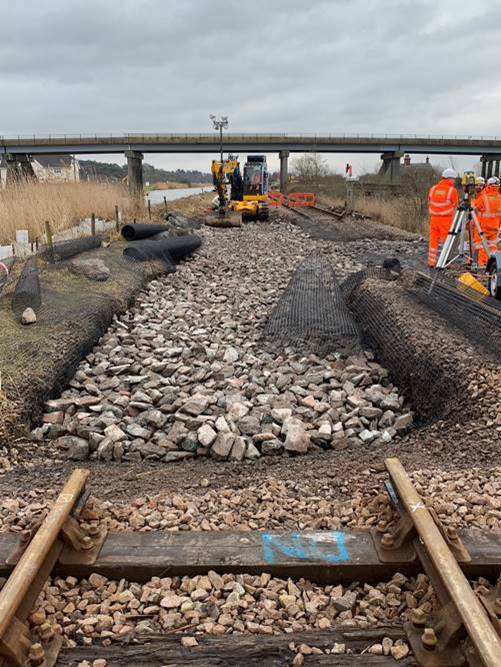 Engineering teams have worked around the clock to rebuild the tracks after the train was removed safely last weekend. Up to 500 tonnes of rock and ballast have been used to reinstate the embankment under the track bed to replace the original material that was washed away.