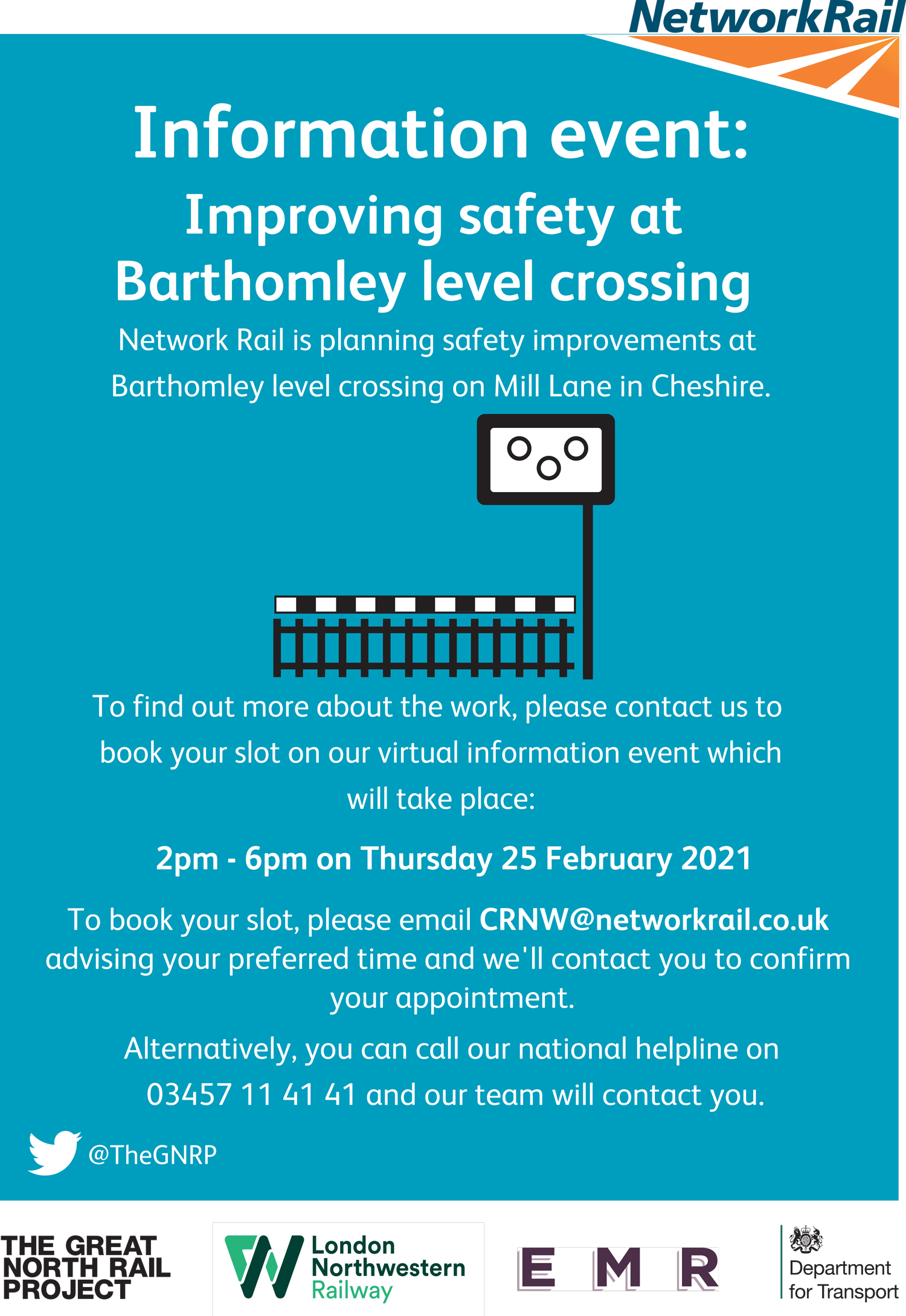 Anyone wanting to book a time slot to ask questions between 2pm and 6pm needs to register by emailing CRNW@networkrail.co.uk, with the words “Barthomley Level Crossing”.