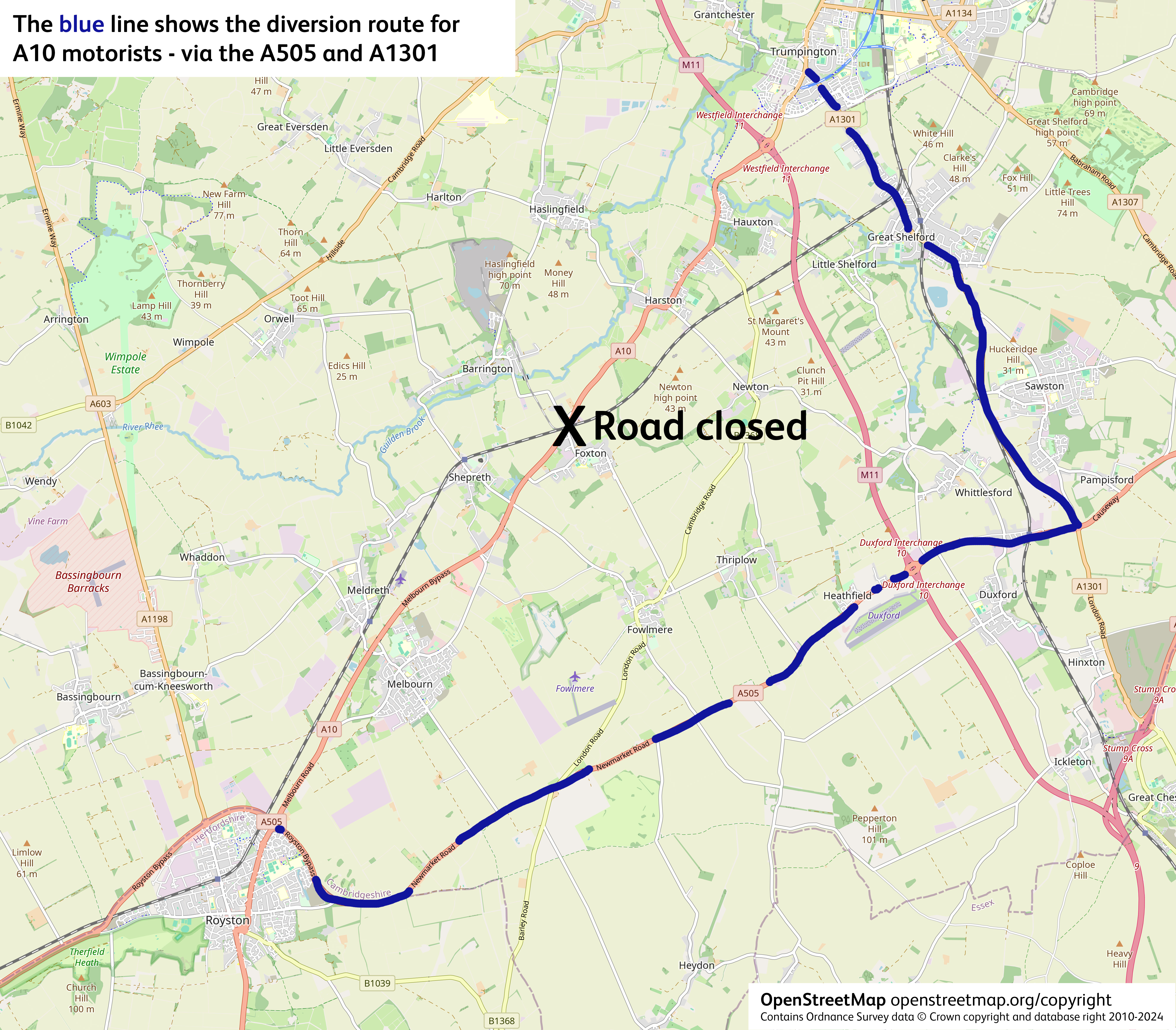 There will be a signposted diversion for motorists travelling on the A10 between Royston and Cambridge while Foxton level crossing is closed. The diversion route will direct drivers onto the A505 between Royston and Duxford and the A1301 between Duxford and Trumpington.