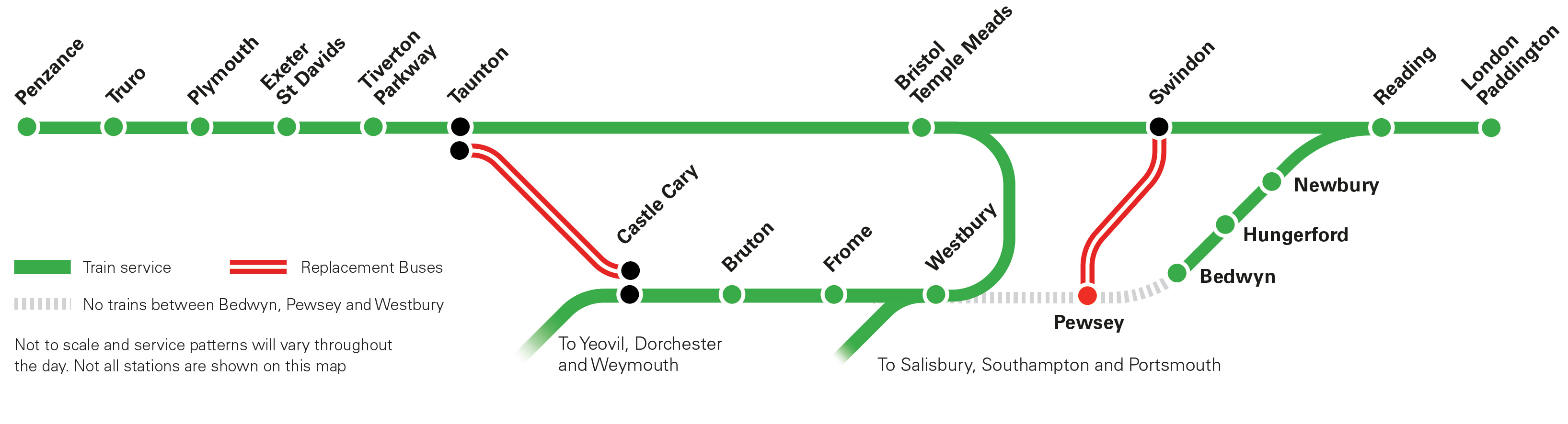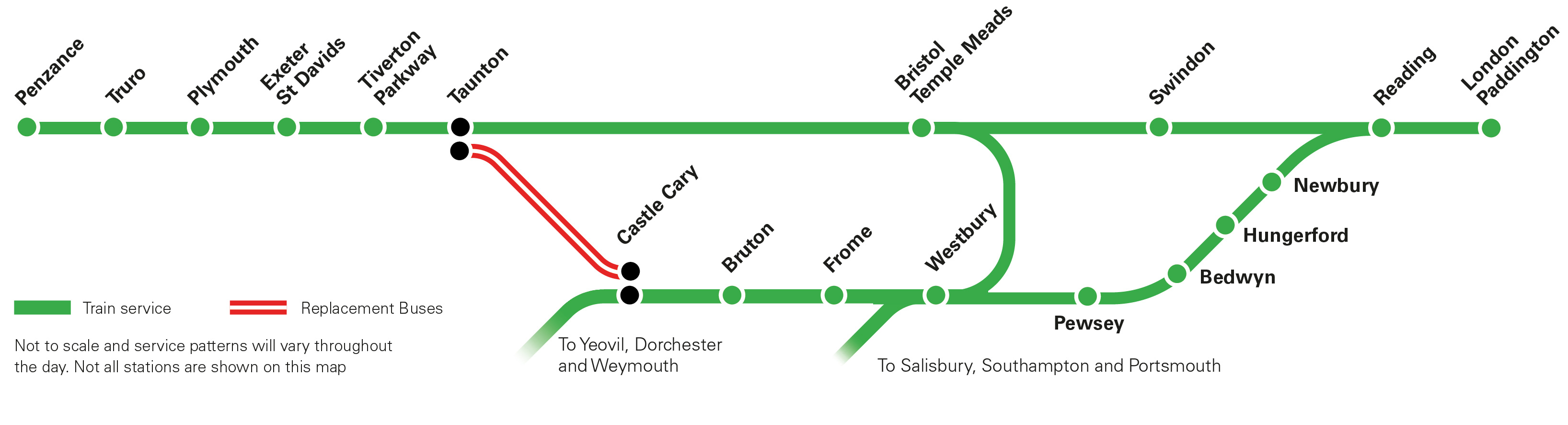 “Buses will replace trains between Castle Cary and Taunton stations, with buses connecting Pewsey and Swindon at the weekend.