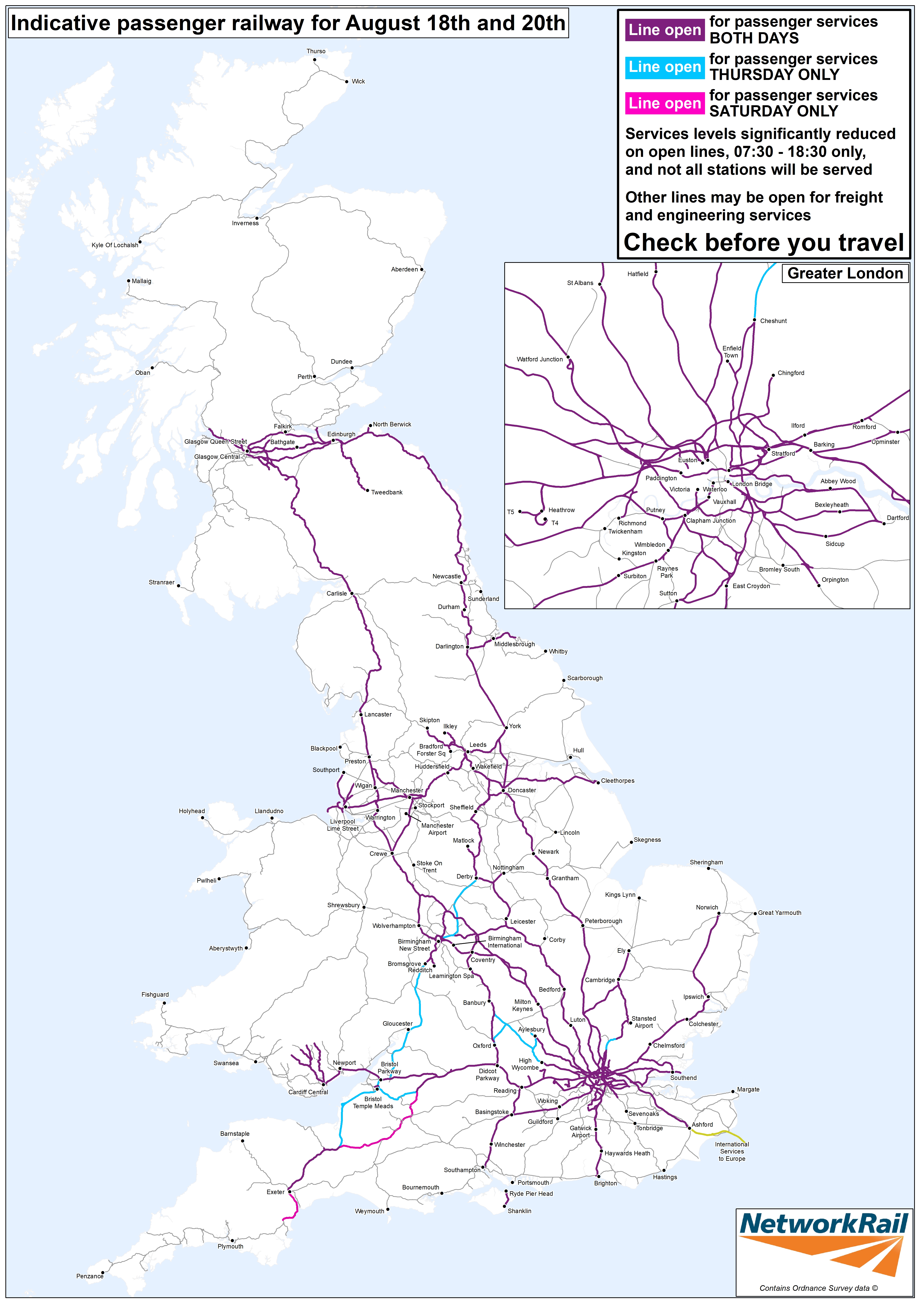 - Special timetables for 18 and 20 August have now been published on National Rail Enquiries, with trains starting later and finishing much earlier than usual, between 7.30am and 6.30pm