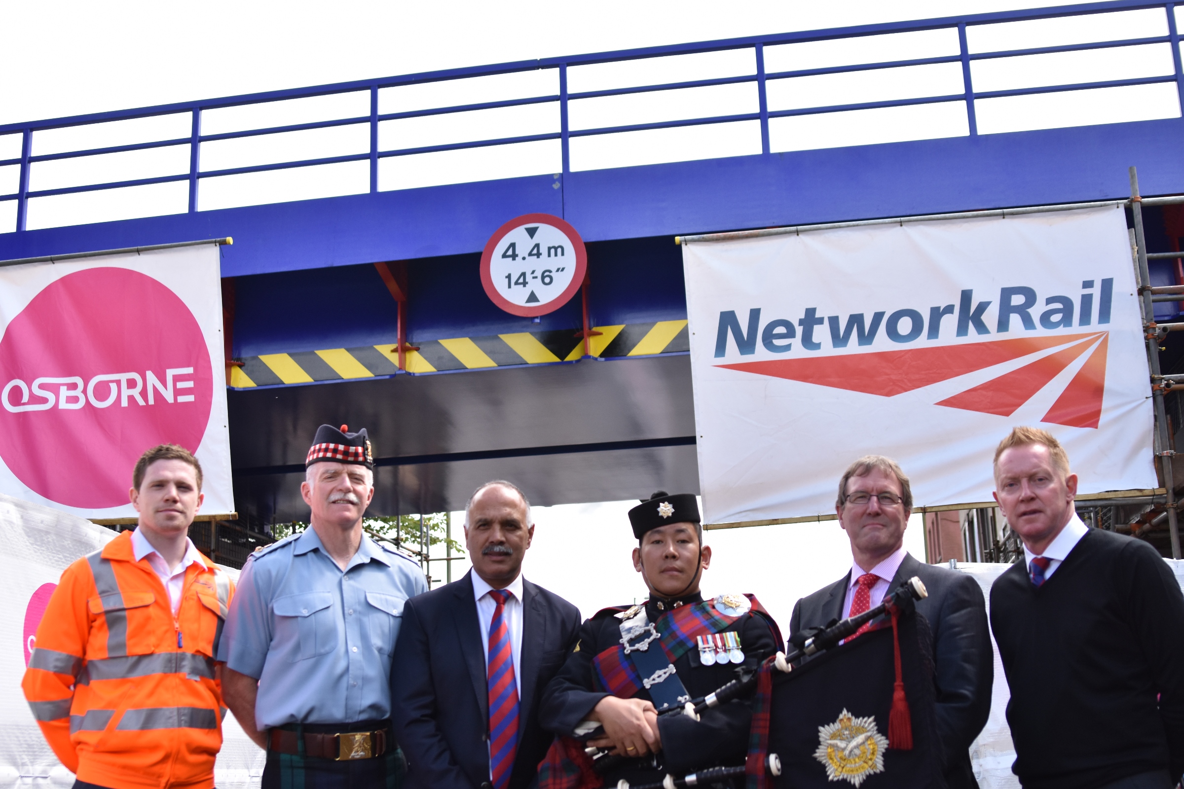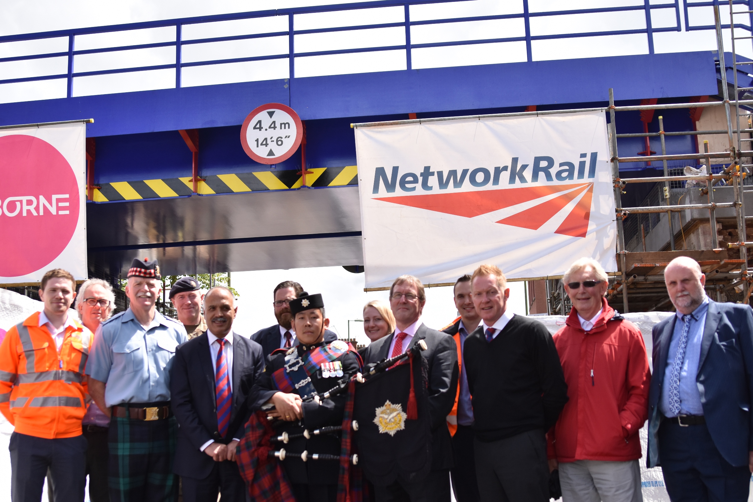 Network Rail has unveiled its new railway bridge over Aldershot High Street, alongside representatives from the Aldershot Garrison, Aldershot F.C. and Rushmoor Borough Council who were representing Sir Gerald Howarth, MP.