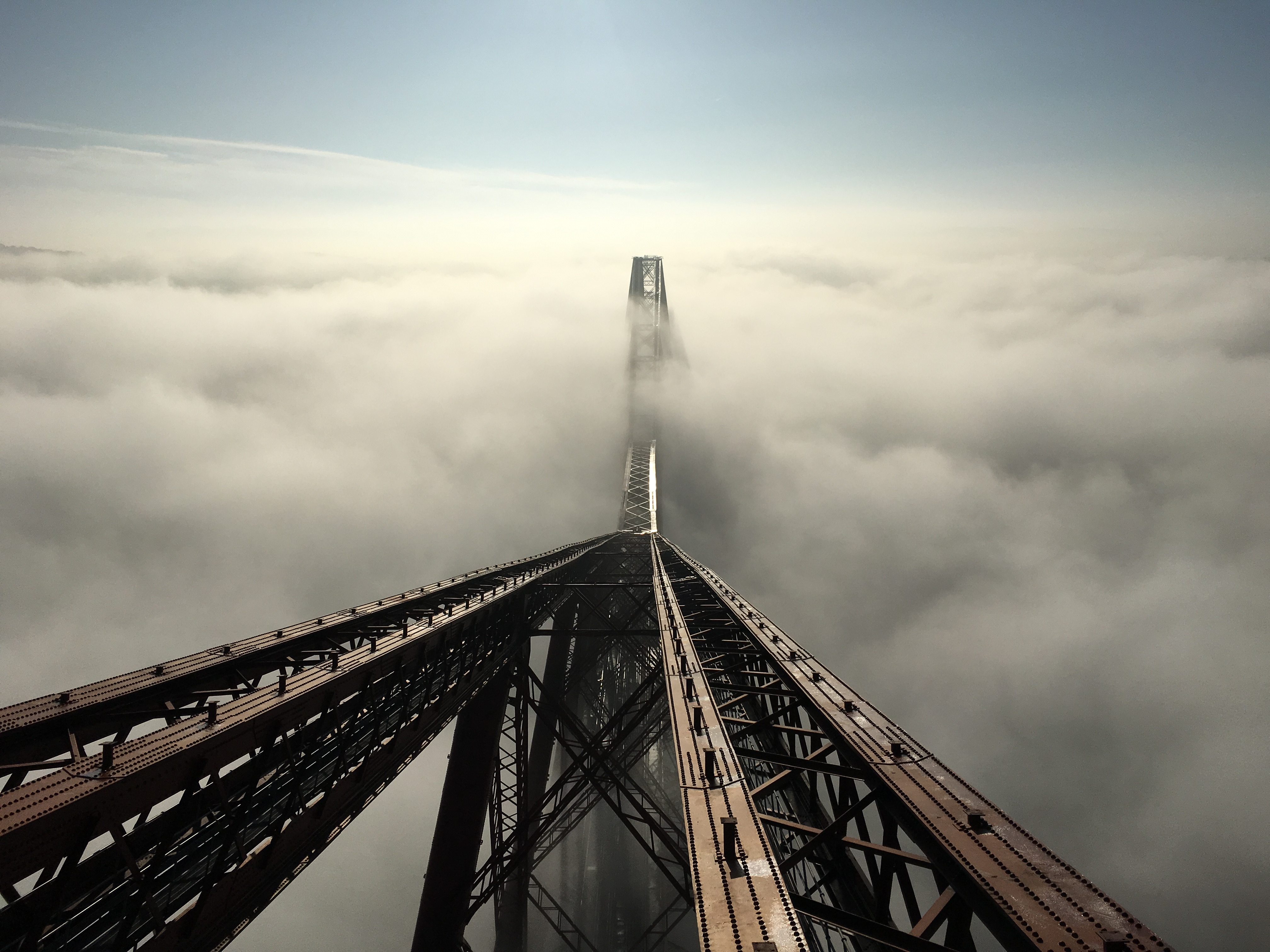 Despite the base of the bridge being shrouded in a familiar north sea haar, Sir Peter himself managed to take these pictures from the bridge and its viewing platform at the top of the Fife Tower in North Queensferry where the view was exceptional. The top of the 110m high bridge was bathed in bright sunshine, providing rare views of the upper sections of the bridge emerging from the fog.