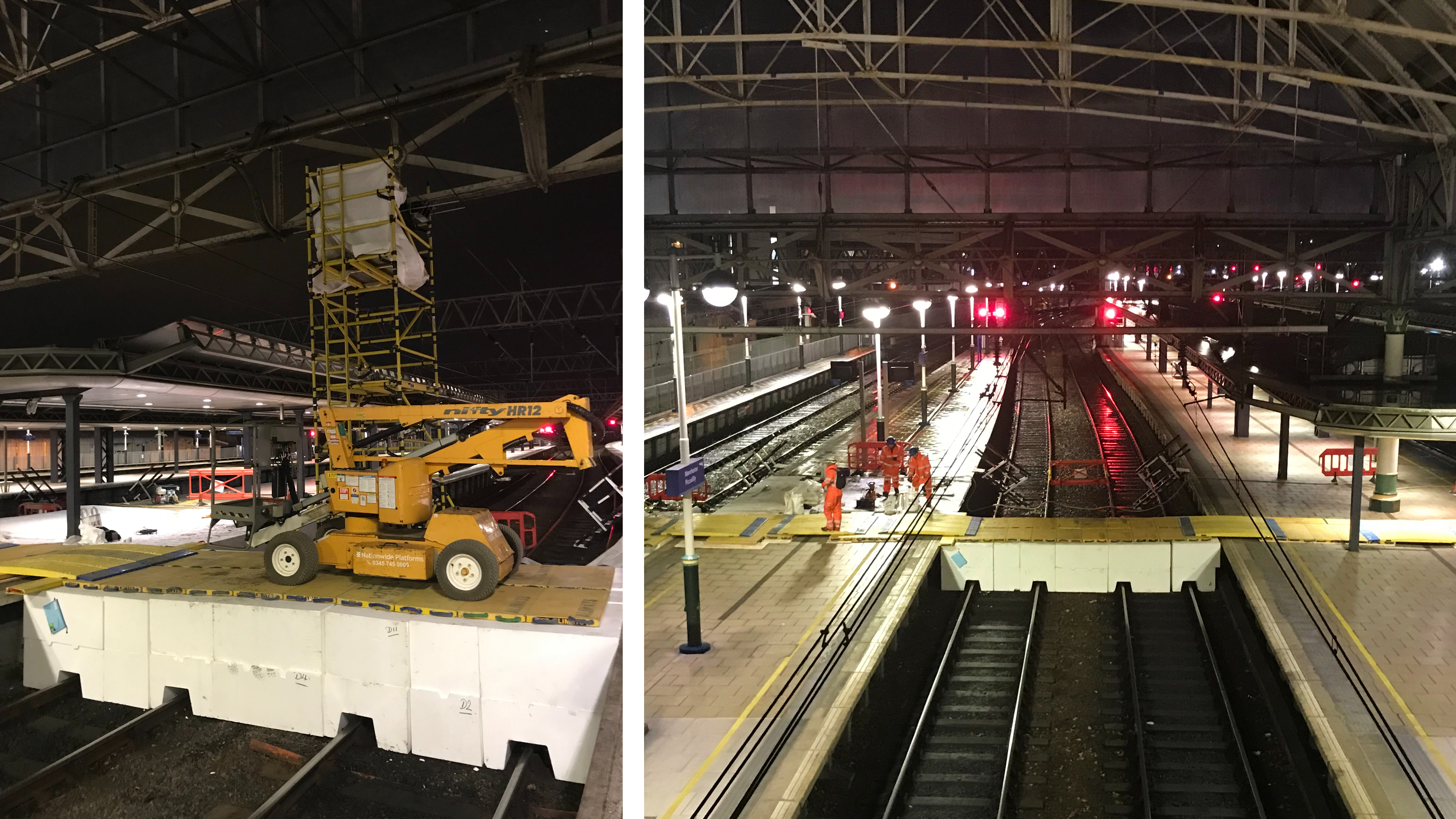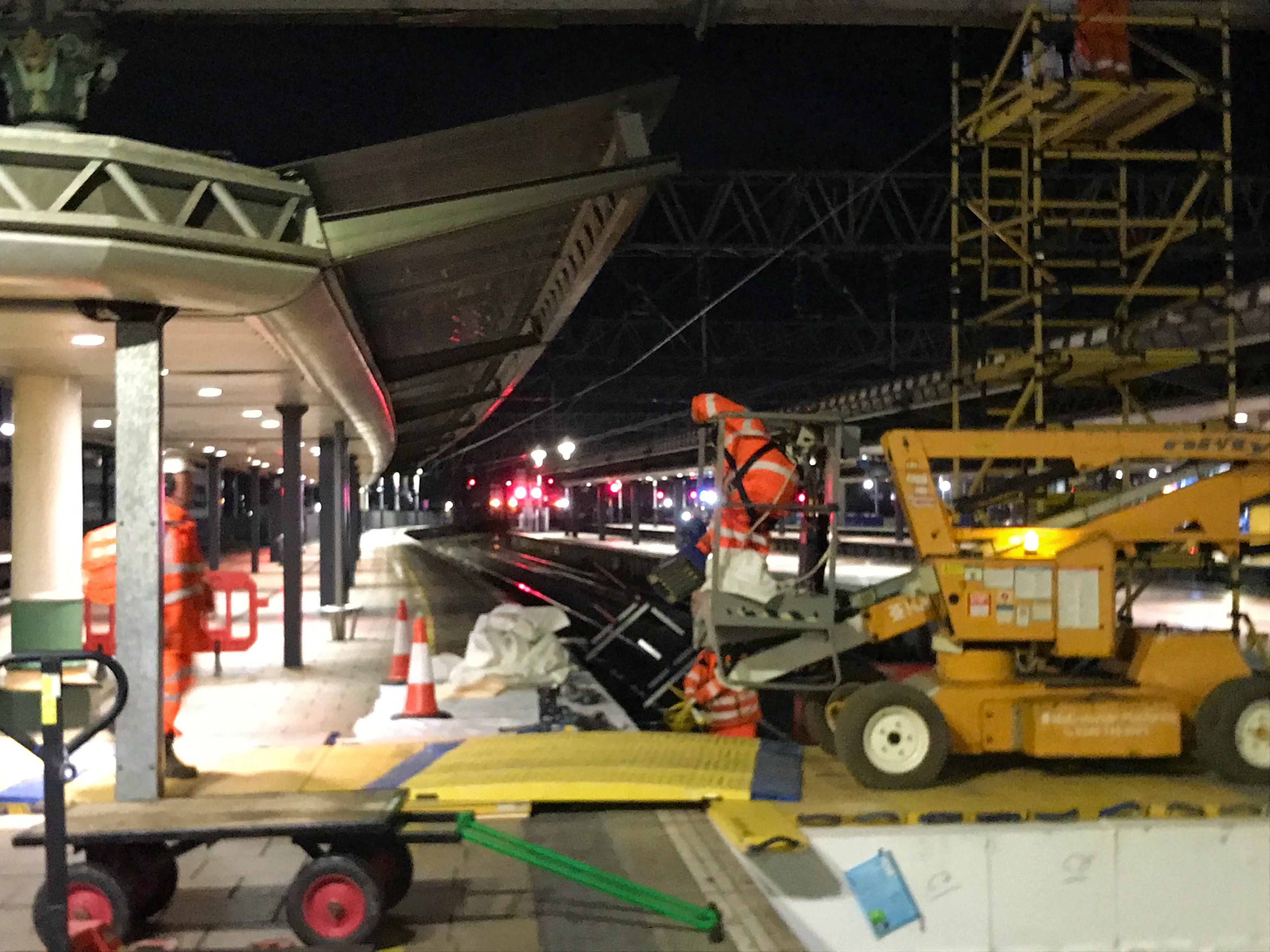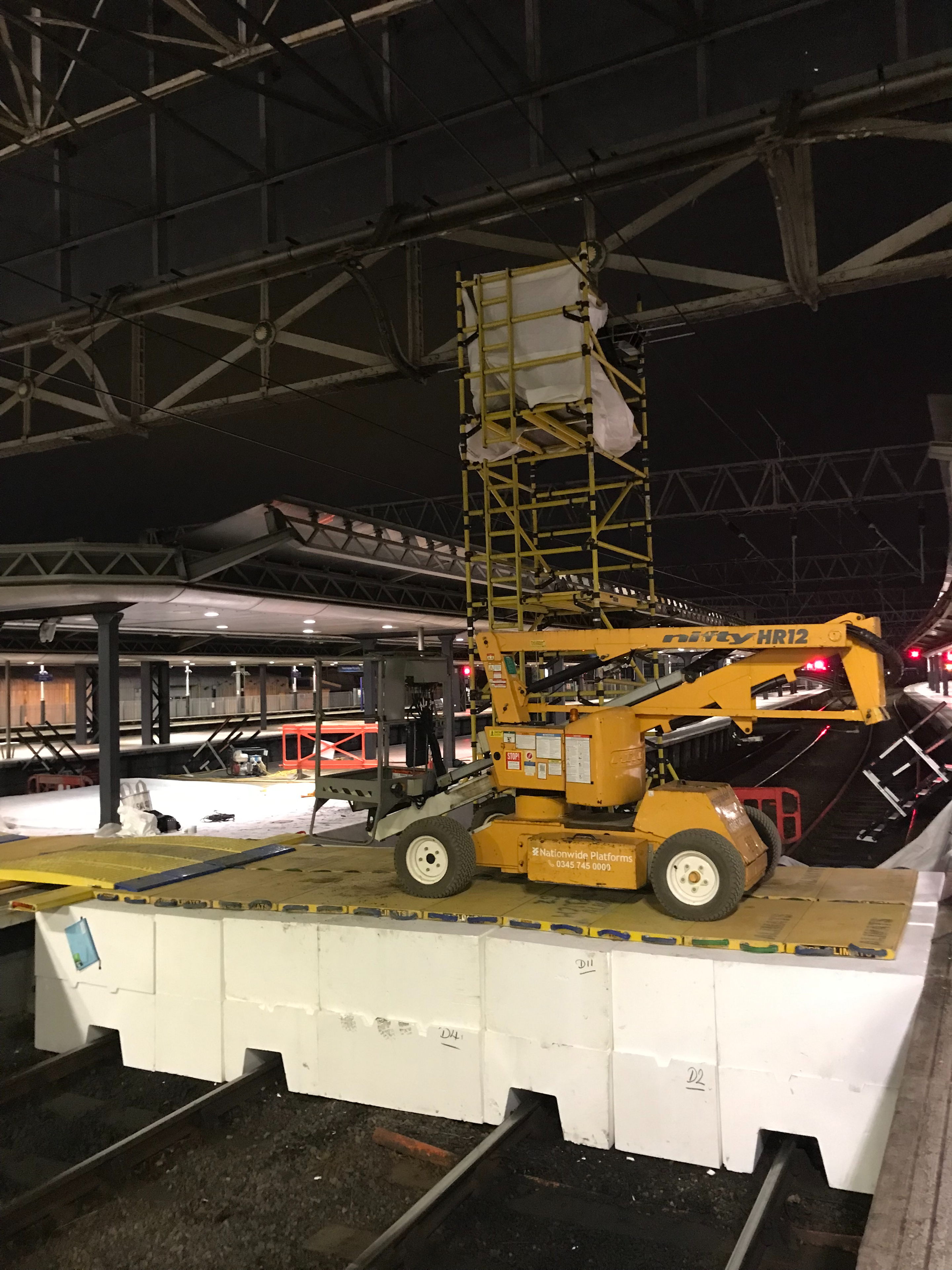 Polystyrene blocks were used to bridge the gaps between platforms to build a temporary route along the width of the station so that mobile elevated working platforms (MEWPs) could reach the roof structure.