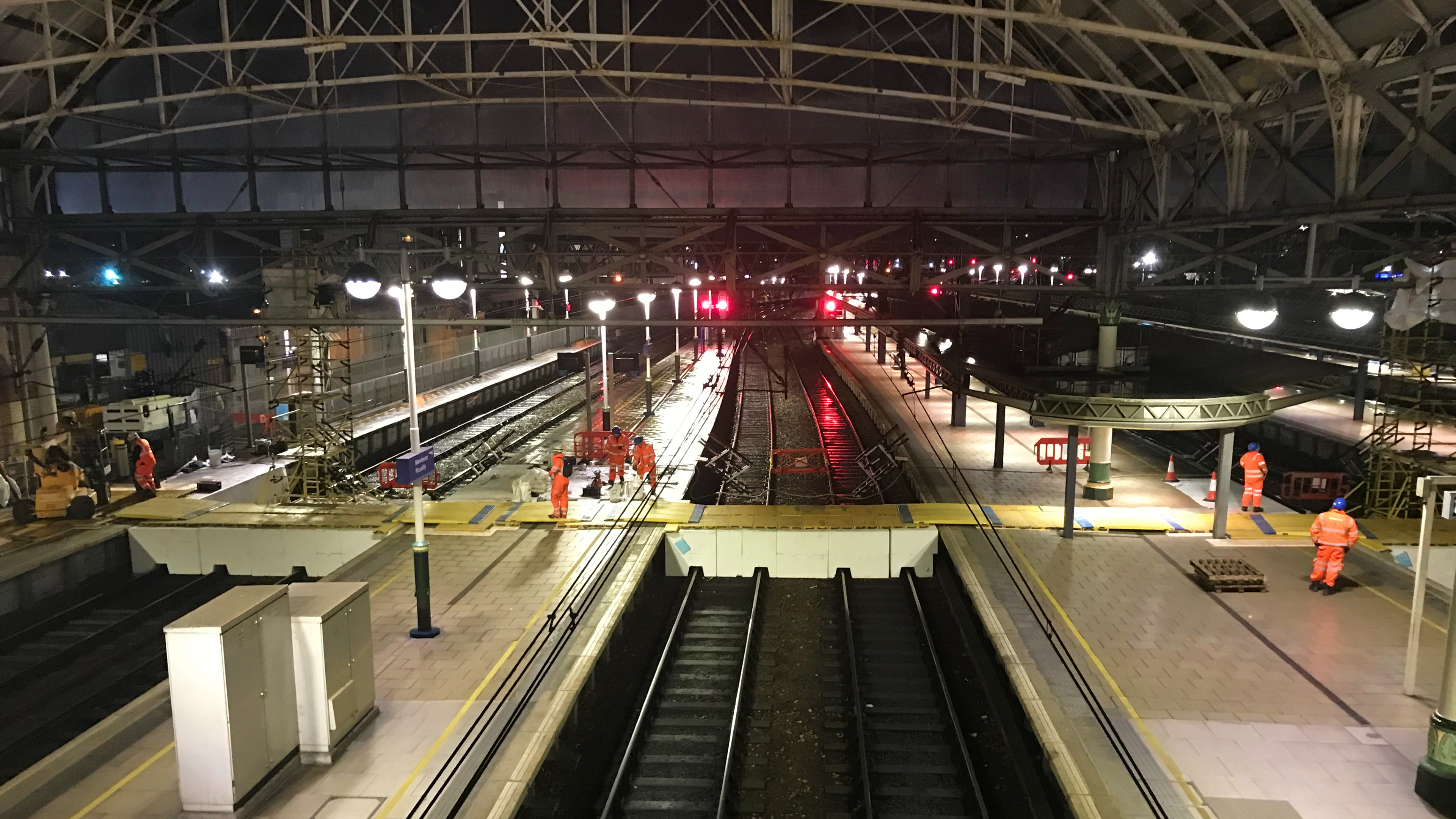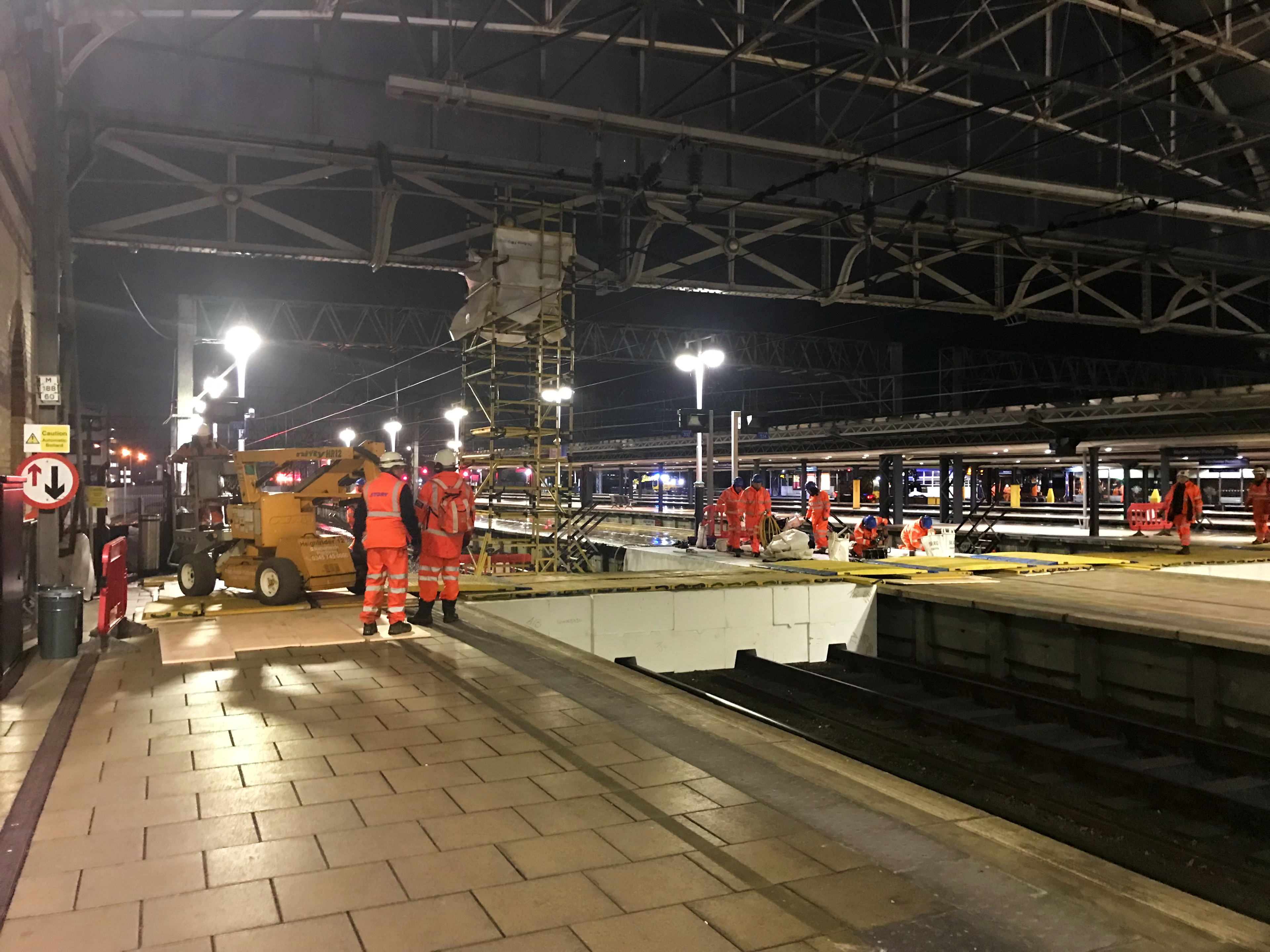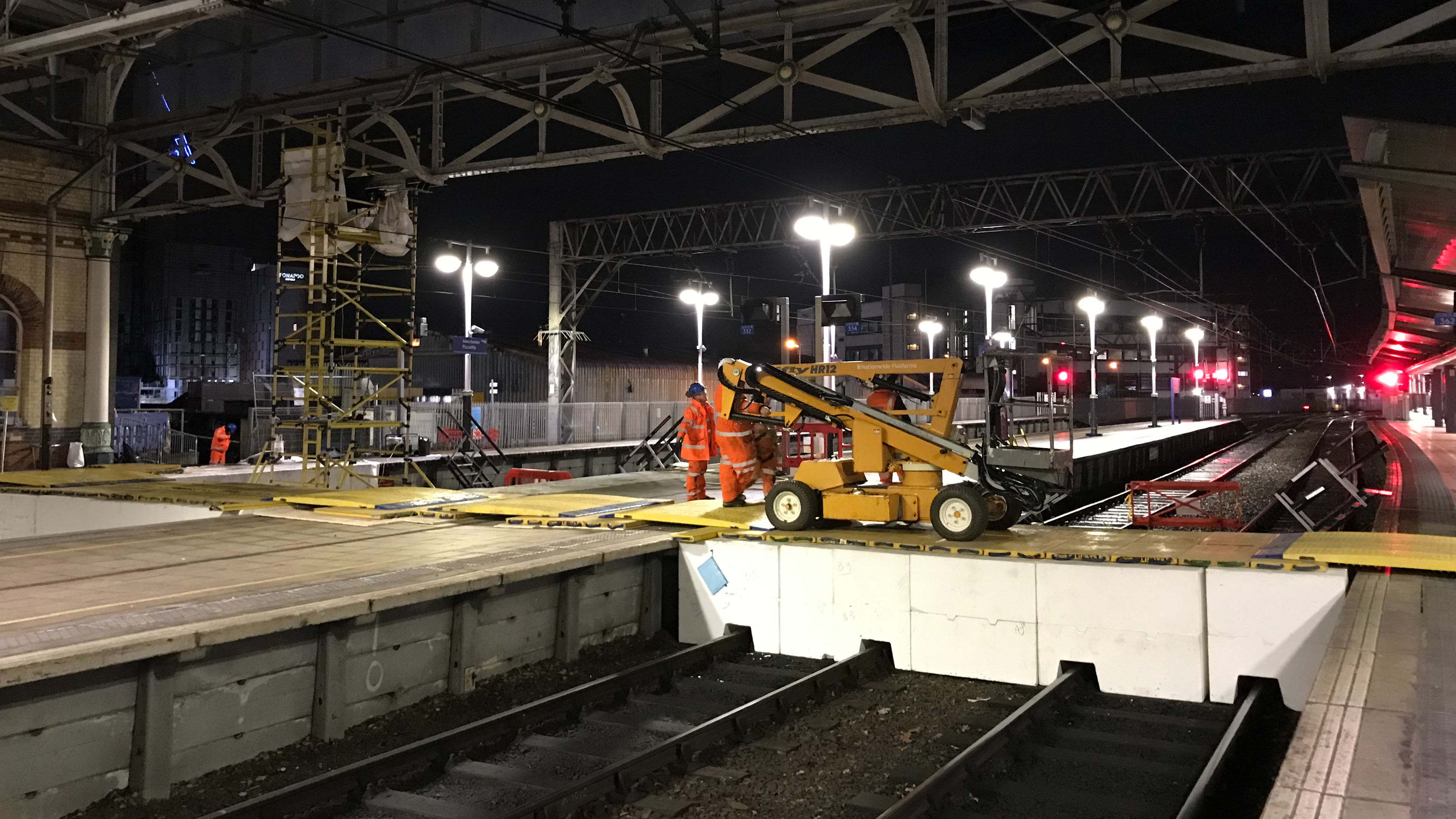 Polystyrene blocks were used to bridge the gaps between platforms to build a temporary route along the width of the station so that mobile elevated working platforms (MEWPs) could reach the roof structure.
