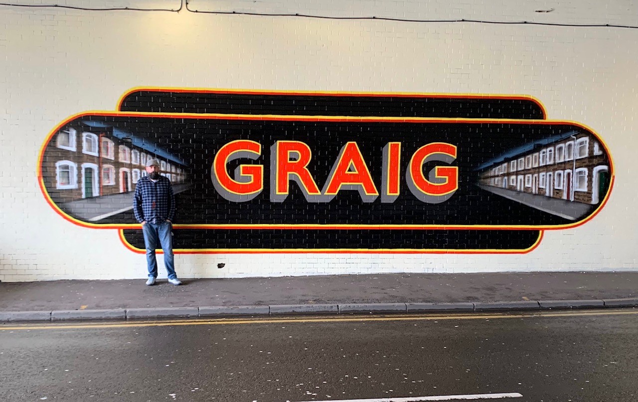 The ‘Graig’ street art image shows the artist, Lionel Stanhope, standing next to his work.