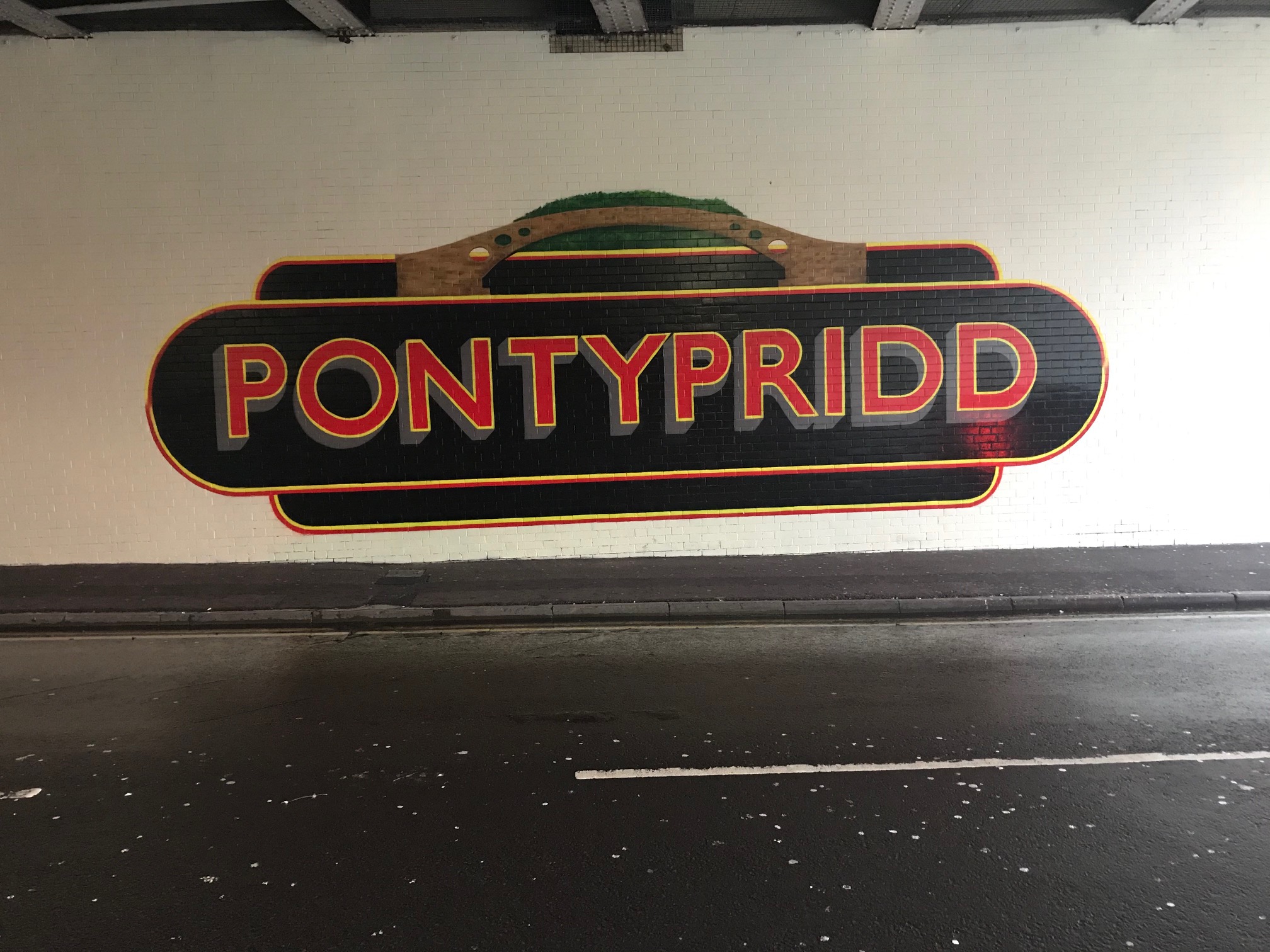 The 30ft by 12ft murals mirror a vintage railway sign, with the lettering ‘Pontypridd’ on one side of the wall and ‘Graig’ on the opposite side.