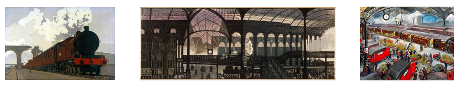 Photos featured are: Passenger Express: The Symbol of Comfortable Travel (London, Midland and Scottish Railway poster artwork) by Norman Wilkinson (1878–1971). © National Railway Museum. Image credit: National Railway Museum / Science & Society Picture Library (left); Liverpool Street Station by Edward Bawden (1903–1989). © The estate of Edward Bawden. Image credit: The Higgins Bedford (centre); Euston Station: Loading the Travelling Post Office by Grace Lydia Golden (1904–1993). © Royal Mail Group Ltd. Image credit: The Postal Museum (right).