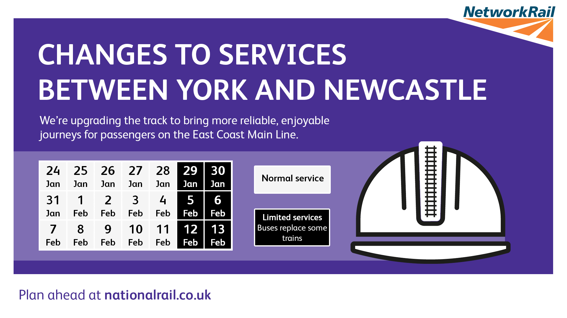 - Limited services on 29/30 January, with no trains calling at the station on 5/6 February, and 12/13 February as Network Rail upgrades track between York and Newcastle