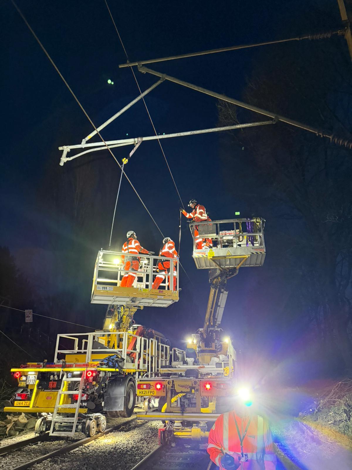In less than 48 hours, engineers installed over 300m of overhead line and repaired another 600m. They also repaired four support structures above the railway and ensured the line was safe.