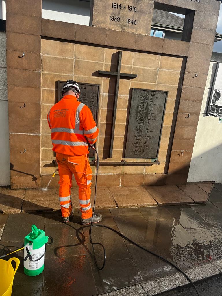Councillor Gary Johnson of Caerphilly County Borough Council, said: “On behalf of Newbridge Royal British Legion, I would like to thank Network Rail and AmcoGiffen for a wonderful job of cleaning our Cenotaph and the area around it, it is looking ready for our remembrance service on Sunday.