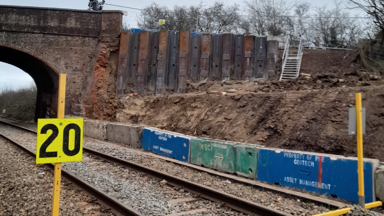 At the start of last week, Network Rail’s engineers were on site conducting detailed investigations to identify the most suitable options to stabilise the embankment so that the road bridge and railway underneath it could be safely reopened to traffic. Network Rail worked with specialist civil engineering contractors Balfour Beatty to design metal sheet piling to act as a retaining wall to support the embankment and road.