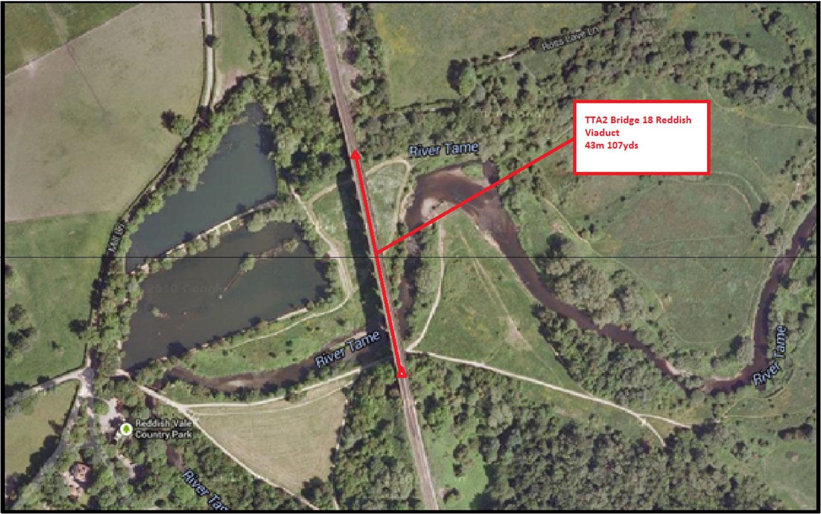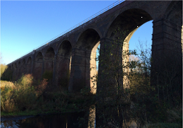 The 16 span viaduct was built in 1875 and carries the rail line over the River Tame and Reddish Vale Country Park. A local legend states that during construction a local witch cursed the viaduct and anyone who counted the number of arches