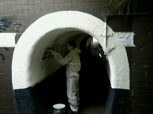Grantham Station was the scene of a somewhat unusual sight on Friday 31 July. Armed with a roller and some white paint, a young offender made amends for his anti-social behaviour by spending nine hours painting over graffiti and removing weeds from the station’s foot tunnel.