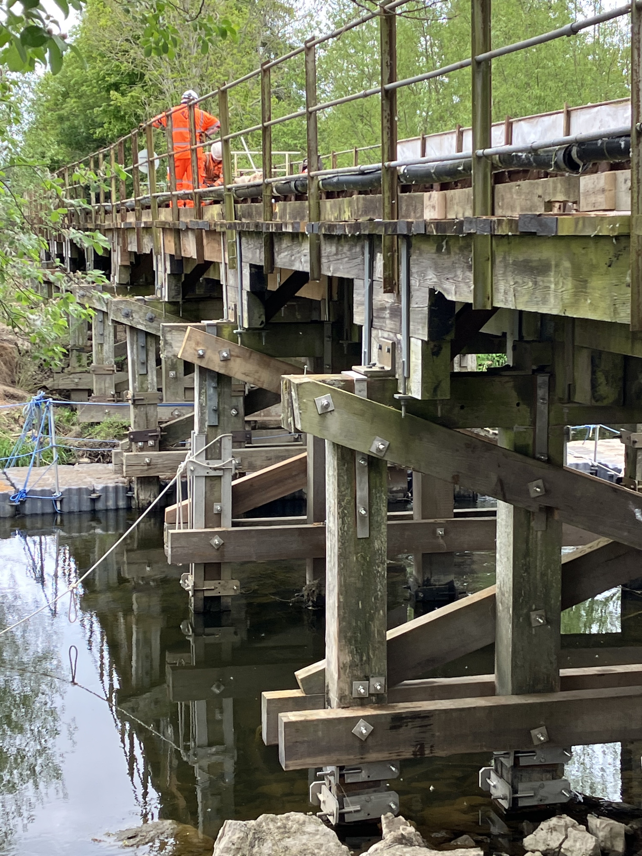 By jacking up the railway on top of the viaduct and working from floating platforms, or pontoons, on the river, teams of engineers from Network Rail and contractors AmcoGiffen have replaced three of a total of eleven spans of timber beams. They also carried out remedial work on the rest of the bridge, including the replacement of metallic straps and fixings.