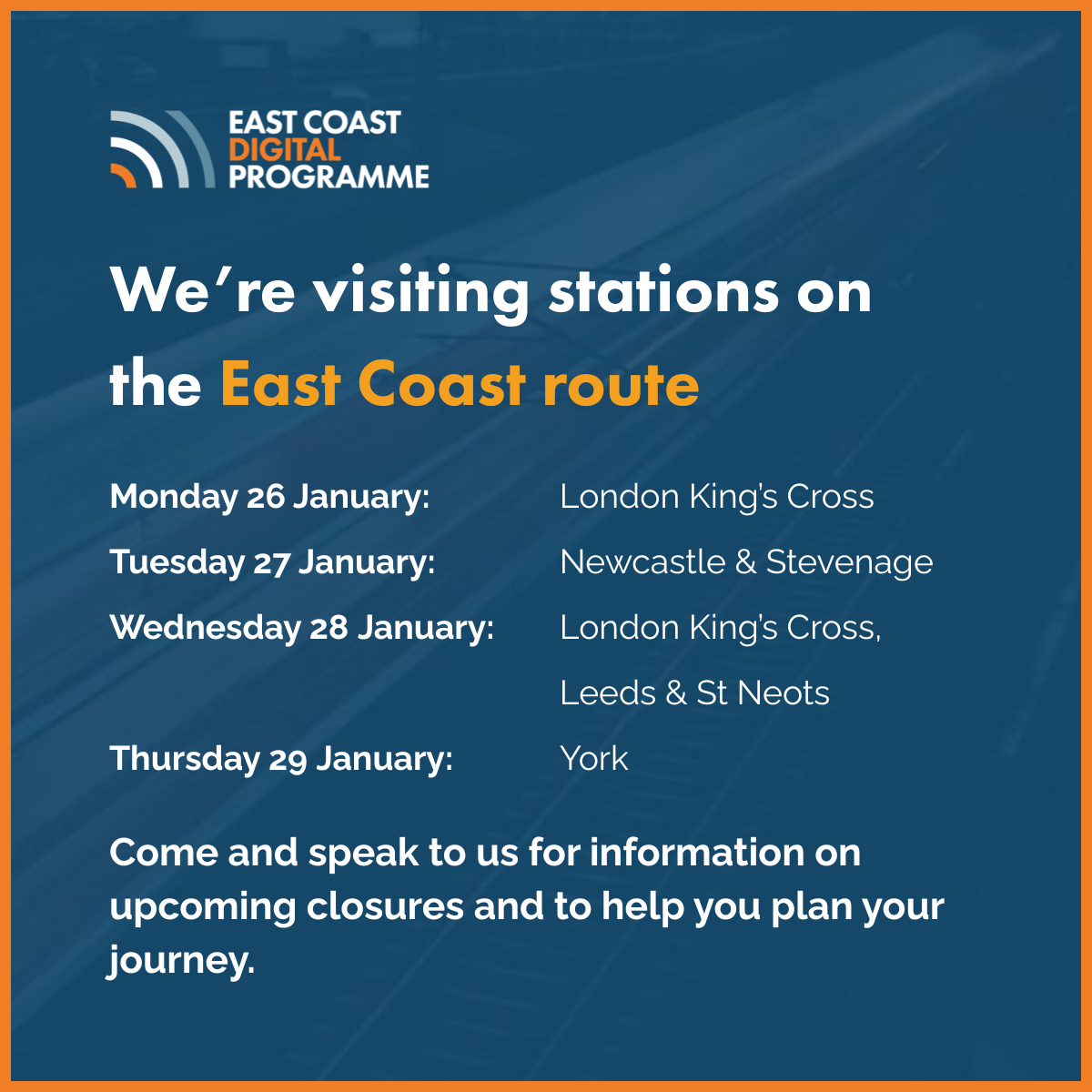 Rail industry colleagues were at London King’s Cross today (Monday 26 January) to speak with passengers about the upcoming engineering work and how to plan their journeys over the affected weekends. These passenger engagement events will continue at stations through the week at peak times in the mornings and evenings: