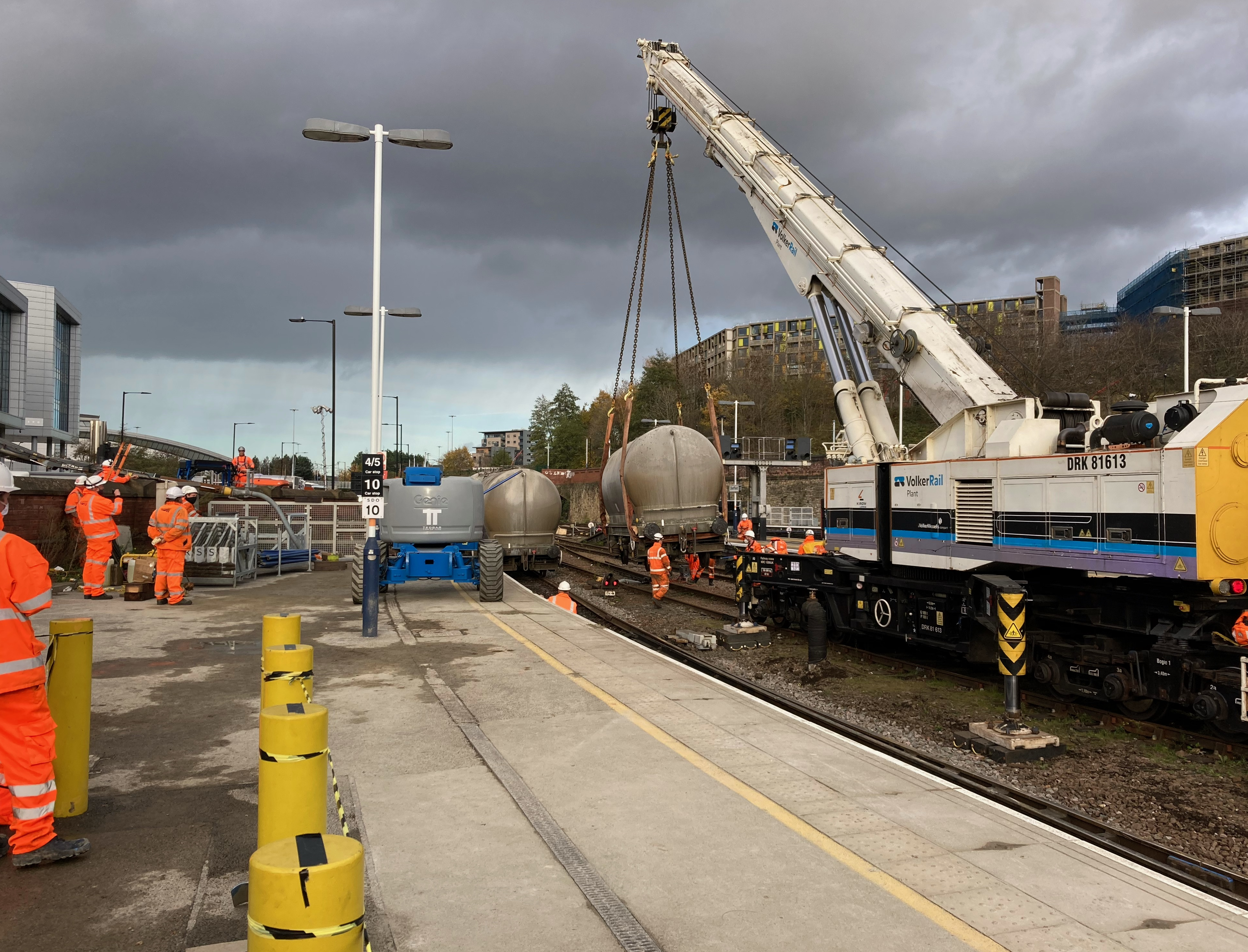 Work is now underway to assess the full extent of the damage to railway equipment and work on a plan for repairs. Network Rail has successfully removed all of the wagons which didn’t derail in the incident and yesterday, workers began removing cement from those wagons which did derail, to enable them to be safely lifted and removed by a crane. The cement is being removed by heavy-duty vacuums which are operating from nearby Sheaf Street, meaning one of the two lanes in front of the station is closed.