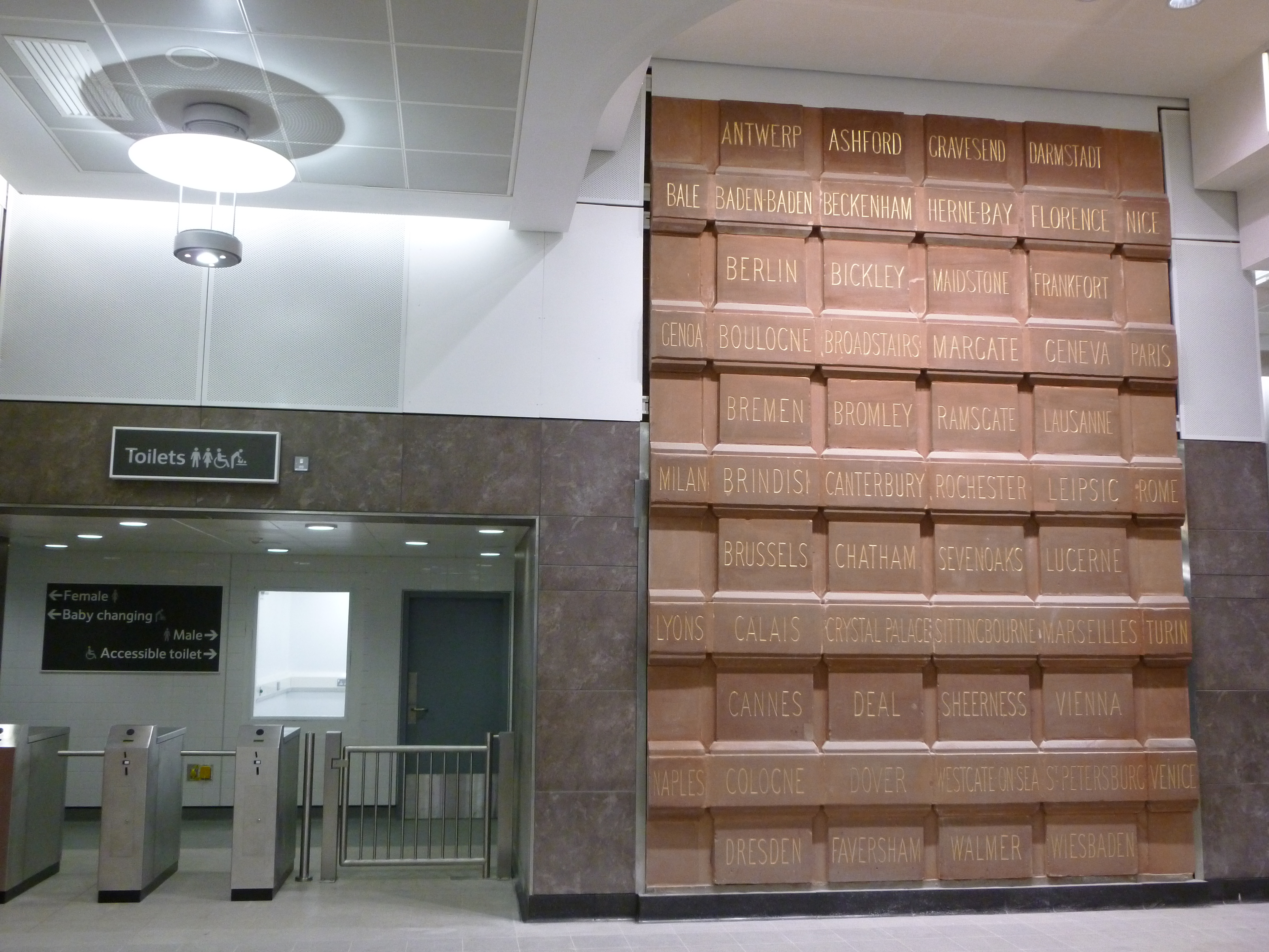 2. The cities featured on the stones are: ANTWERP, ASHFORD, GRAVESEND, DARNSTADT, BALE, BADEN-BADEN BECKENHAM, HERNE BAY, FLORENCE, NICE, BERLIN, BICKLEY, MAIDSTONE, FRANKFORT, GENOA, BOULOGNE, BROADSTAIRS, MARGATE, GENEVA, PARIS, BREMEN, BROMLEY, RAMSGATE, LAUSANNE, MILAN, BRINDISI, CANTERBURY, ROCHESTER, LEIPSIC ROME, BRUSSELS, CHATHAM, SEVENOAKS, LUCERNE, LYONS, CALAIS, CRYSTAL PALACE, SITTINGBOURNE, MARSEILLES, TURIN, CANNES, DEAL, SHEERNESS, VIENNA, NAPLES, COLOGNE, DOVER, WESTGATE-ON-SEA, ST PETERSBURG, VENICE, DRESDEN, FAVERSHAM, WALMER AND WIESBADEN.