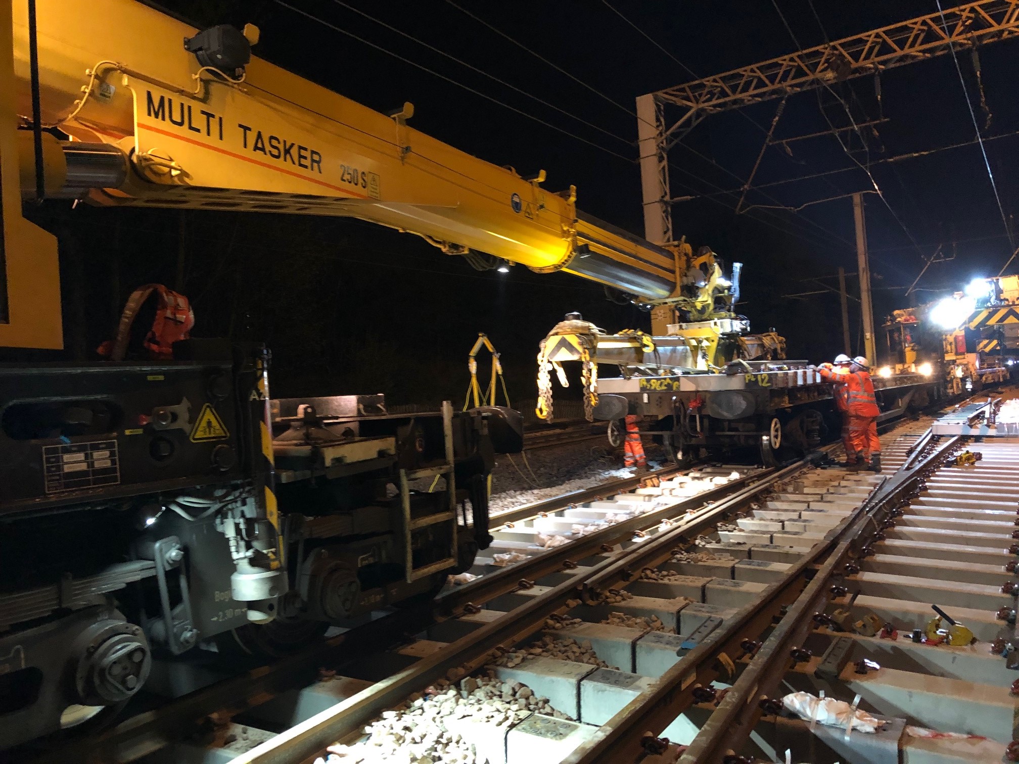 In all more than 2,600 sleepers, 6,600t of ballast and 3,100m of rail were removed and replaced around Rutherglen over three weekends, before 11 engineering trains, and three specialist Kirow cranes worked over the Easter weekend at Shawfield to cut up and remove existing points and lay 50 new pre-assembled track panels.