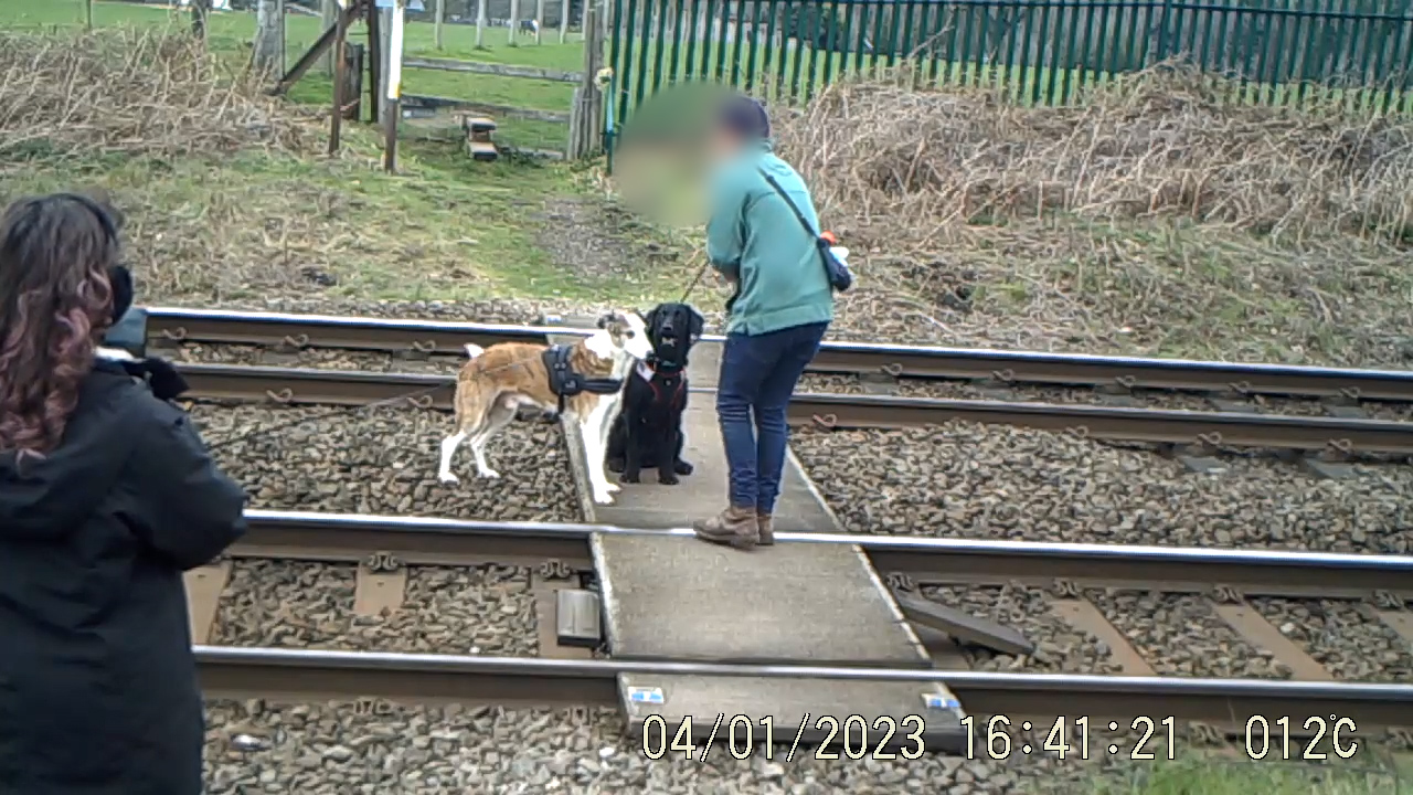 - 1 April 2023 – a dog walker encouraging two dogs to sit on the tracks while an onlooker takes a photo of them.