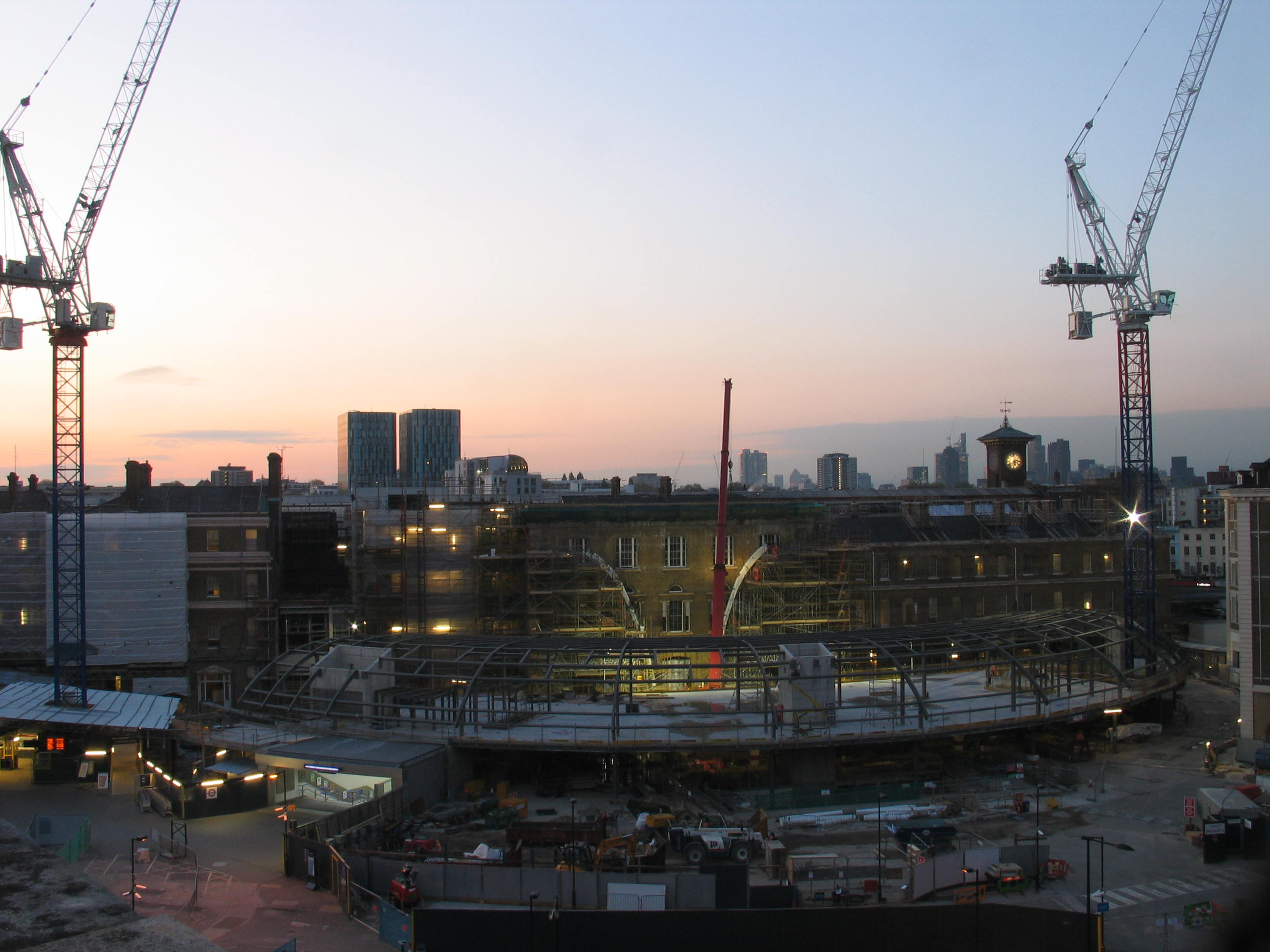 The two beams mark the starting point of the steel funnel which will support the main roof structure of the semi-circular concourse. Three-times the size of the existing 1970s building, the new concourse will dramatically improve the experience of passengers using the station, with new shops and restaurants and improved step-free access to the Underground and St Pancras International.