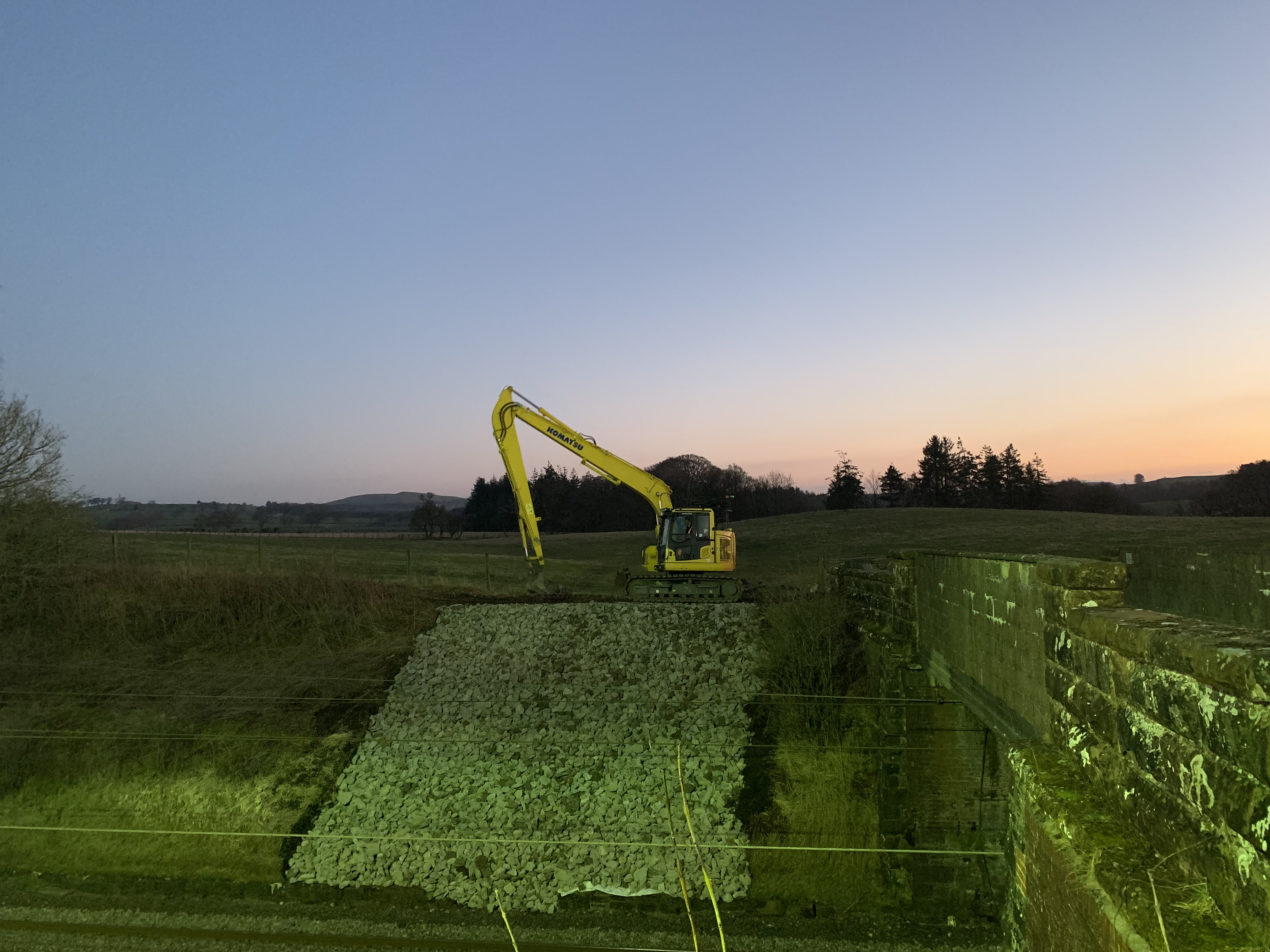 Stone had been delivered and stockpiled in advance and an excavator with a 13-metre reach was positioned on the crest of the slope to carry out the work while a 10-tonne tipper worked to transfer spoil and stone to support. A Road Rail Vehicle (RRV) also supported from track level to assist the work and to transport additional materials.