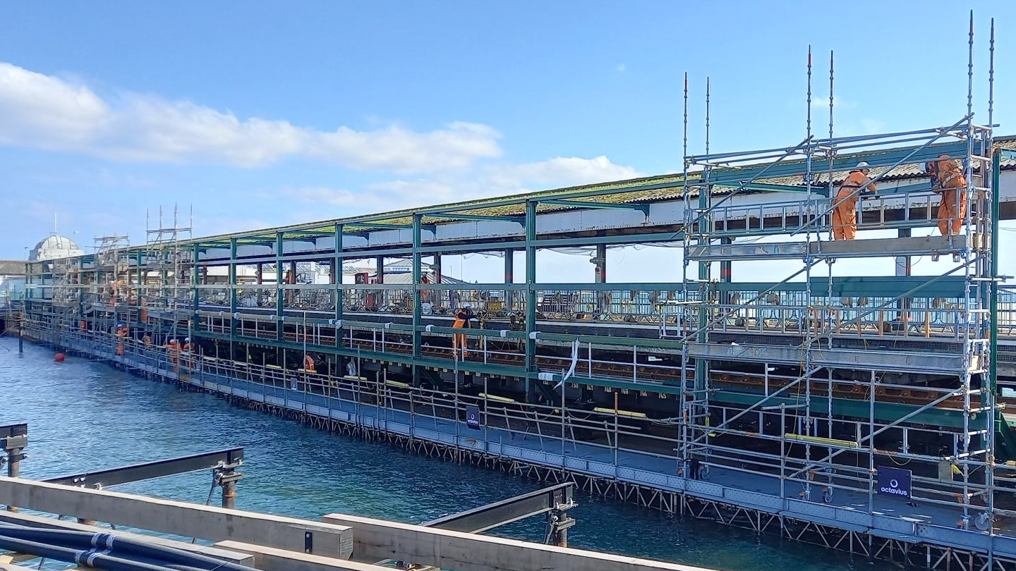Engineers have worked hard to recover from a three-month delay due to extreme weather where storms damaged scaffolding and made it unsafe to work. Since April, at Ryde Pier Head, track and steelwork replacements have been completed and a new weather screen has been installed.