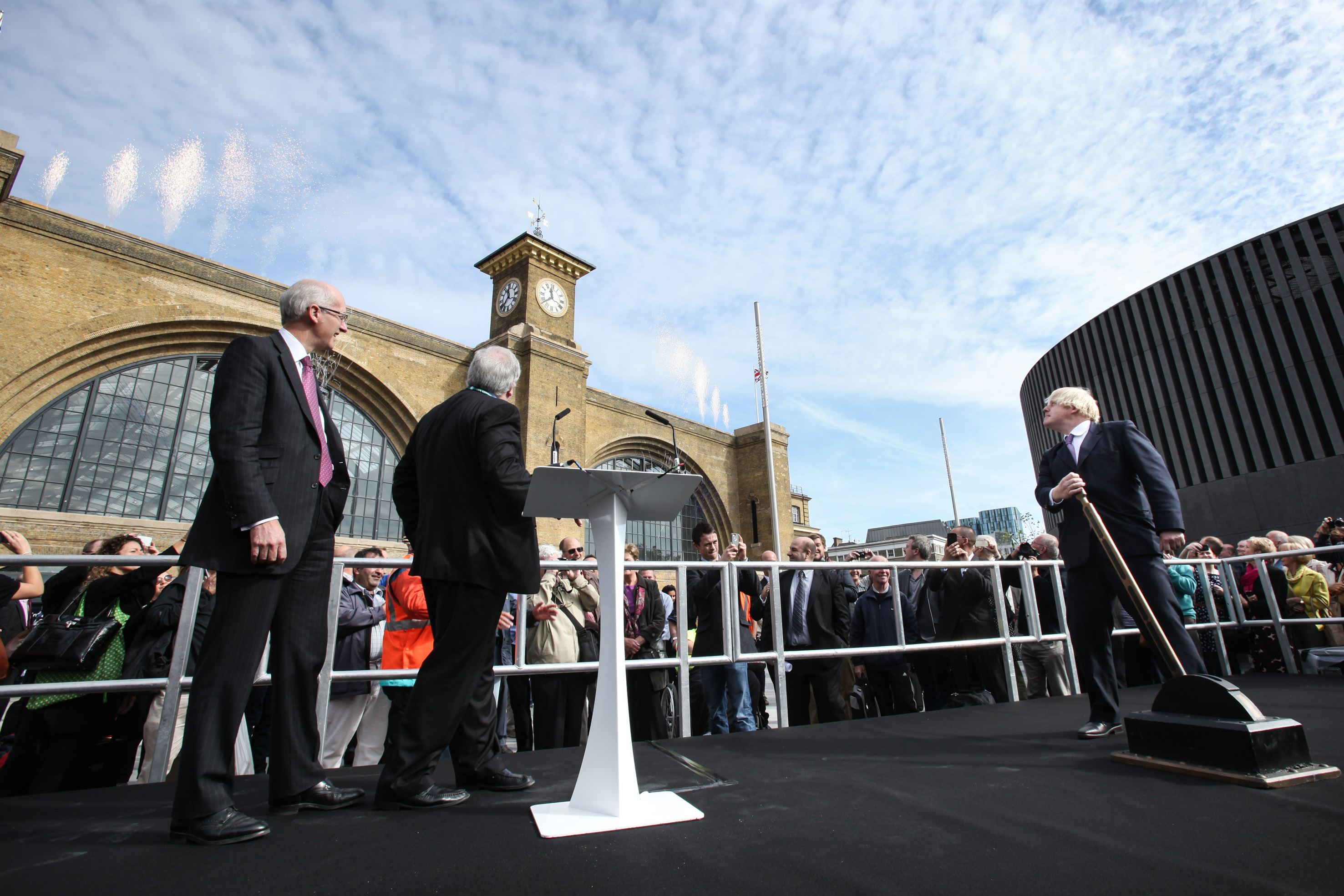 An exciting new chapter in the 160-year history of King’s Cross station began today when the Secretary of State for Transport, Rt Hon Patrick McLoughlin, Mayor of London, Boris Johnson and Network Rail’s chief executive, Sir David Higgins today (26 September, 11:30am) declared the new King’s Cross Square officially open. The occasion was marked by the pulling of a Victorian railway signal lever and explosion of streamer canons.