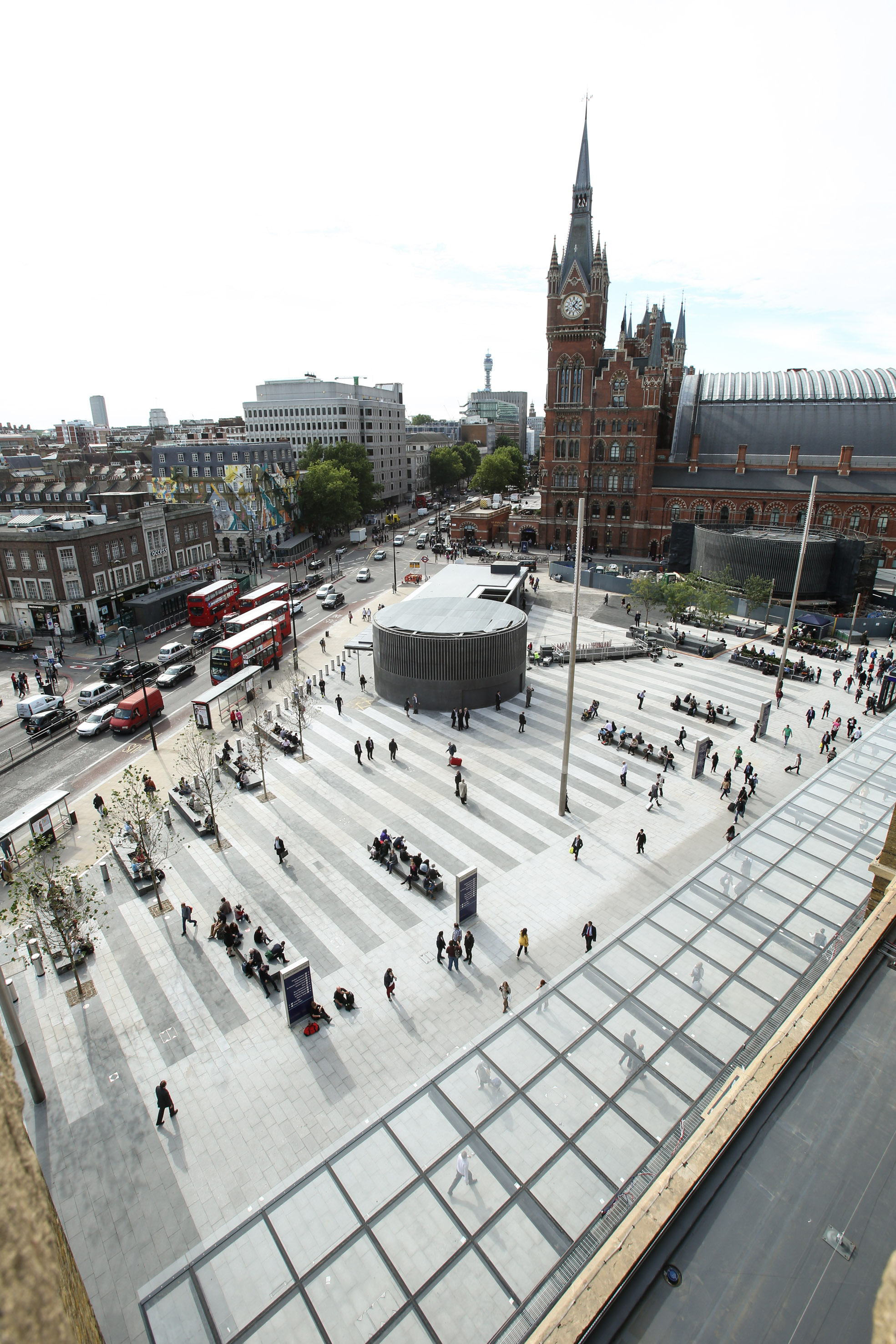 Designed by architects Stanton Williams, the square is big enough to accommodate Big Ben clock tower laid down lengthways and offers rail users, local people and those now moving to work and study in the area a brand new open space as well as improved entrances to the London Underground, an area dedicated to public art, and a stunning lighting scheme to highlight the area’s architectural features.