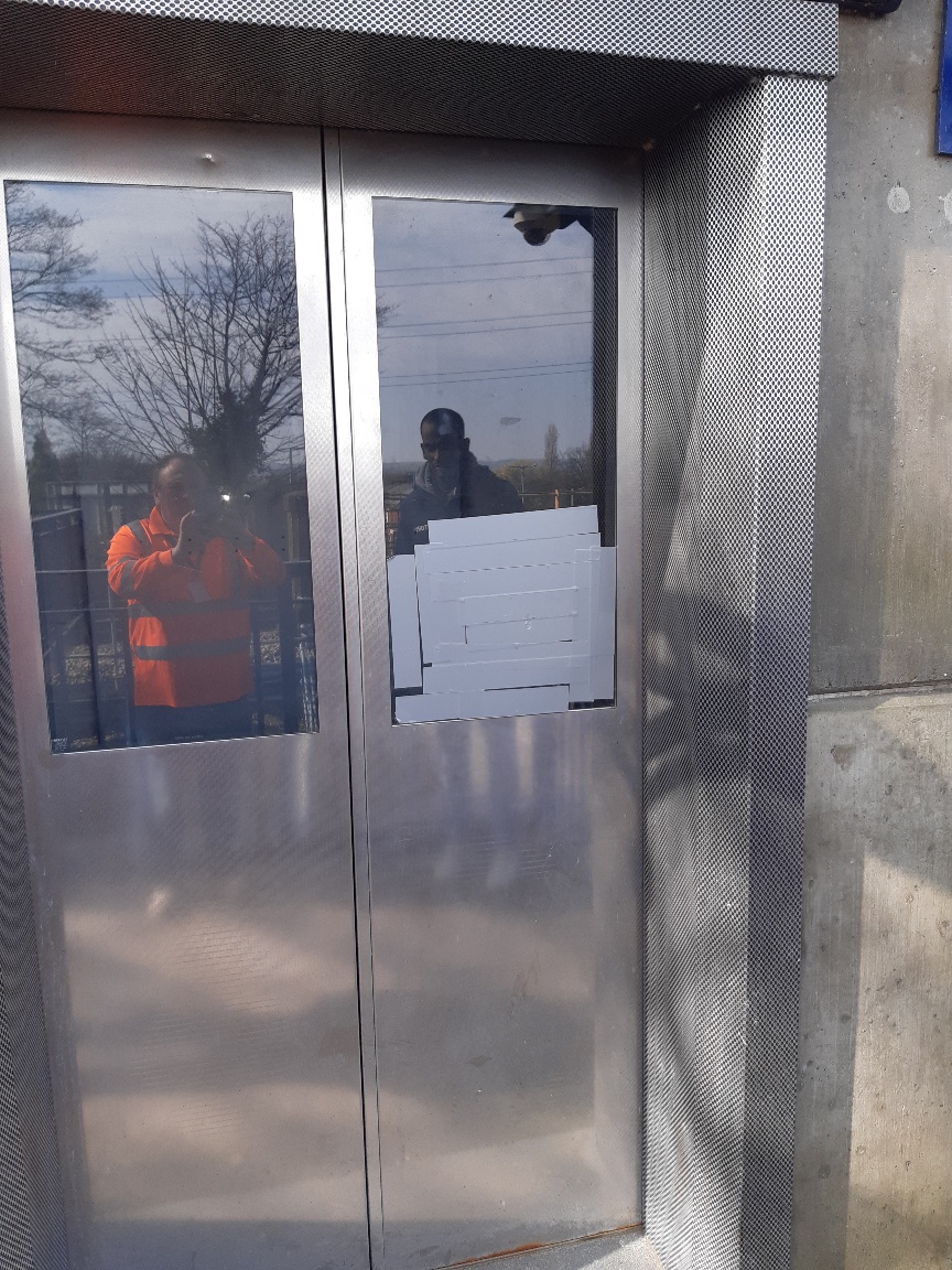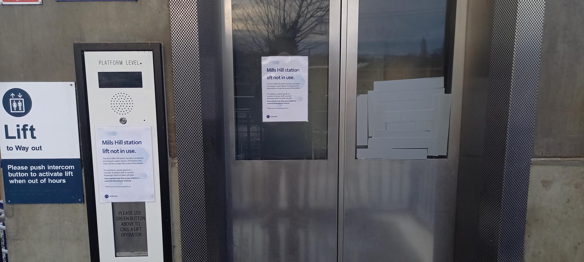 Vandals have kicked in the doors of a new passenger lift at Mills Hill station in Greater Manchester - just 15 months after it was installed to make platforms accessible for everyone.