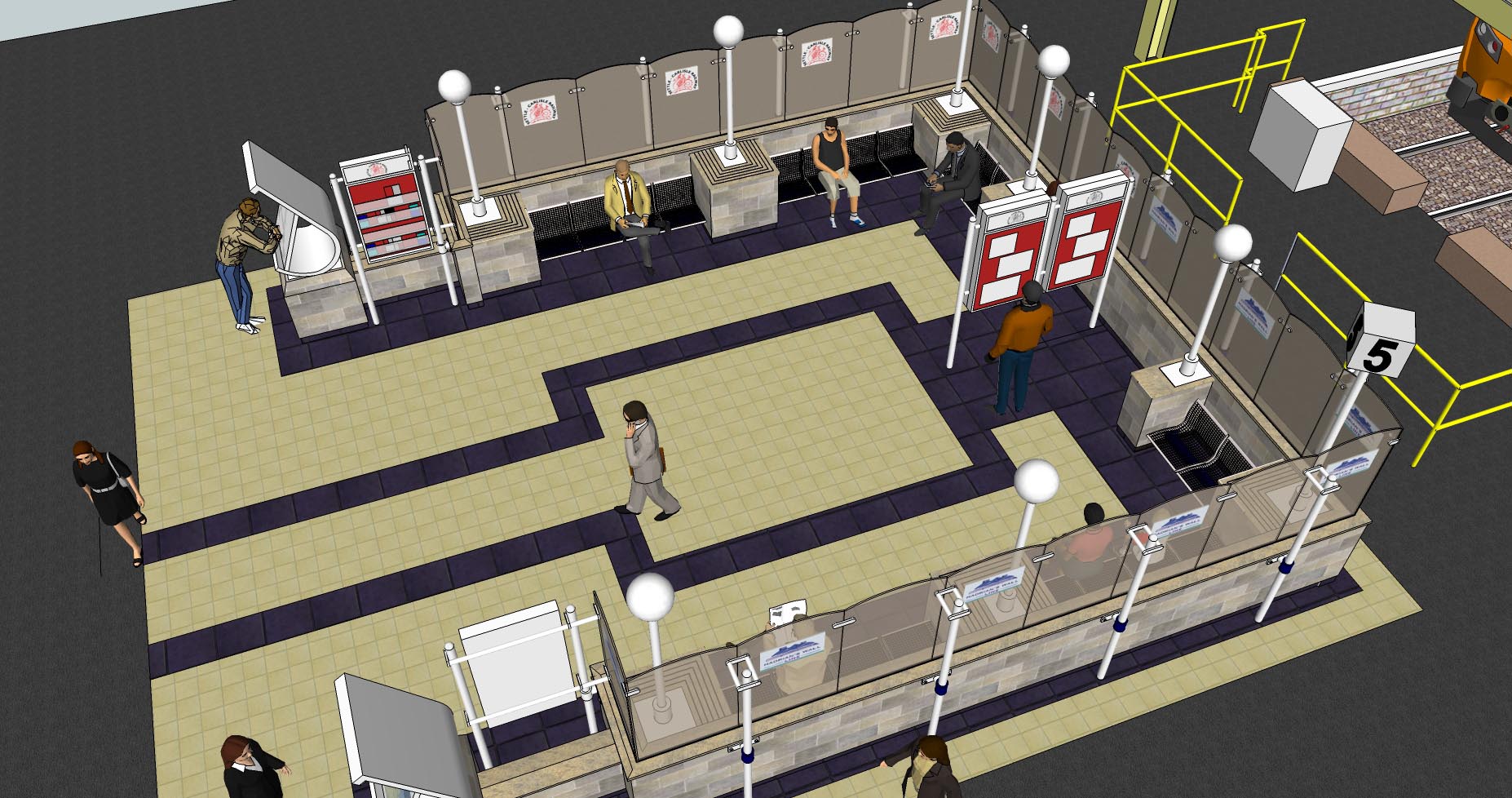 At the other end of the platform the existing waiting area will be refurbished to complement its new counterpart. The red hoops that define the seating area and restrict access to the platform will be removed and a new ‘totem’ will be provided for train service information and the station clock.