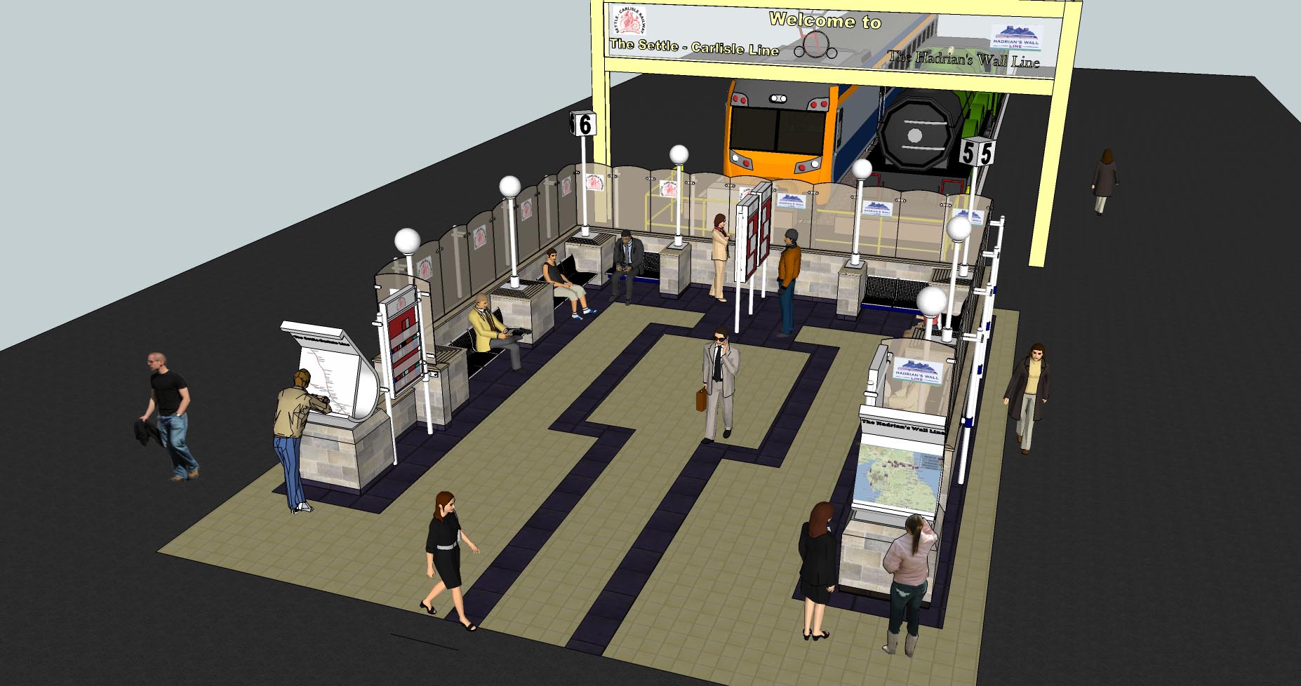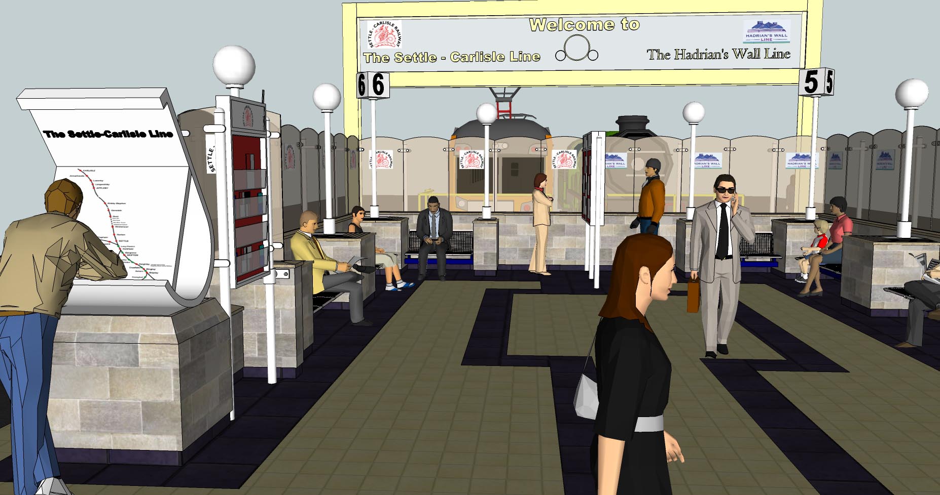 The new seating area will be created at the head of platforms five and six where trains for the Carlisle to Settle line and Hadrian’s Wall Country line (Carlisle to Newcastle) depart. It will be surrounded on three sides by a low stone-clad wall topped with glazed screens to cut out draughts. There will be special diagrams depicting both railway lines and the crowning glory will be a sign across the end of both railway tracks defining them as the ‘Gateway’ to both lines.