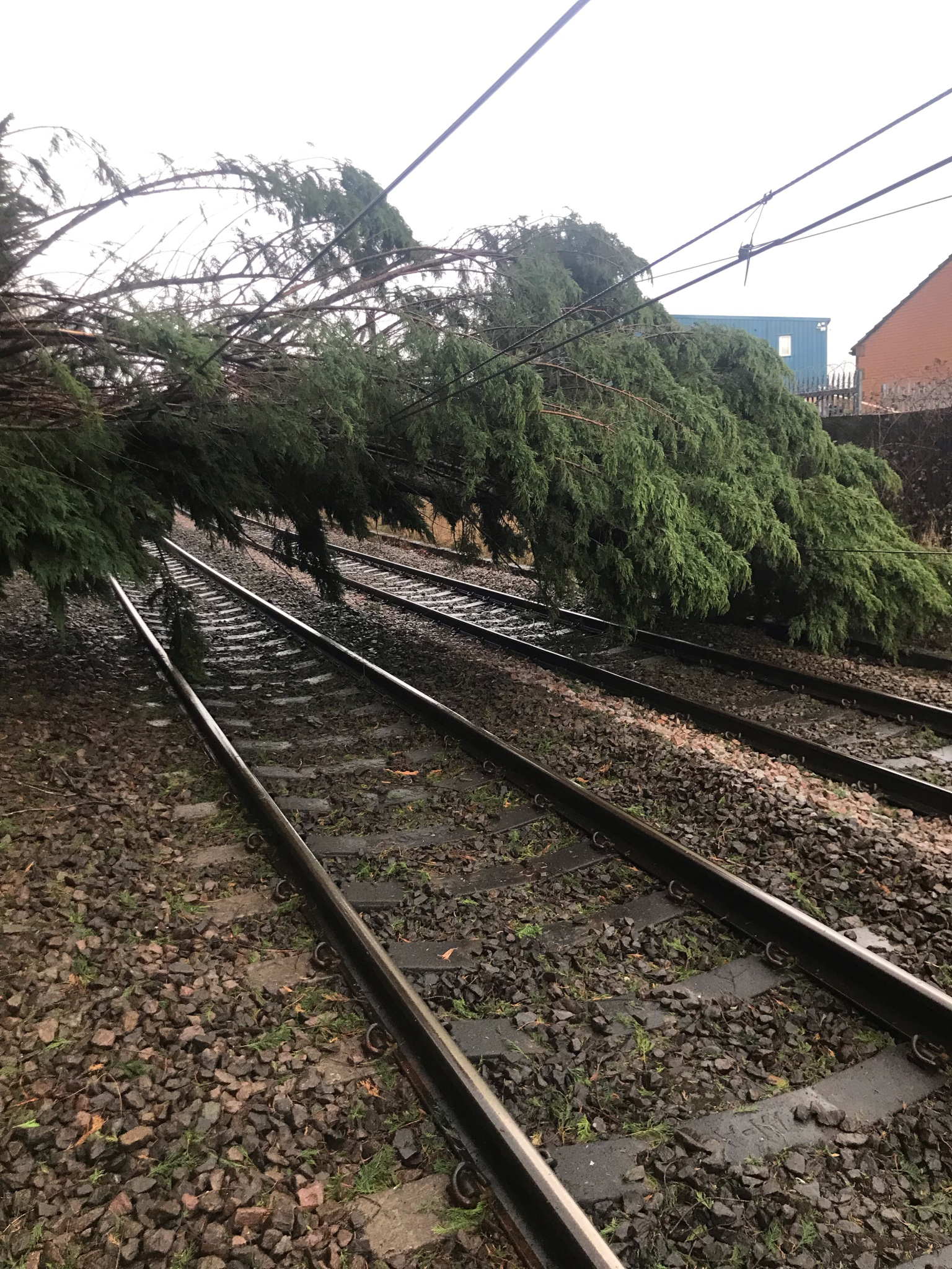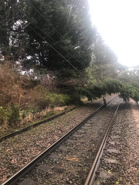 A team of trained chainsaw operators worked through the night to remove the large conifer and repair the train-powering electric wires so that services could be restored at 11:30am today (17 February).