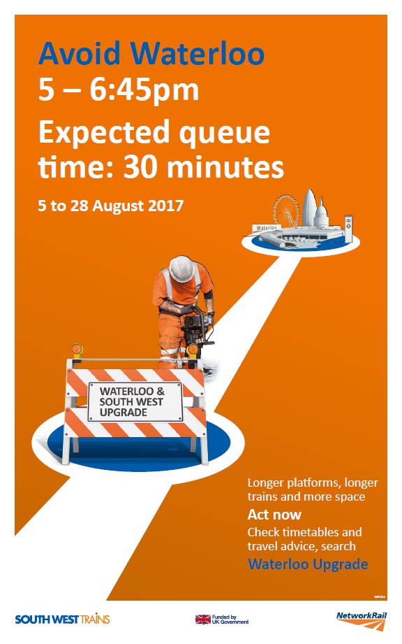 Network Rail and South West Trains are today advising passengers in Surrey to expect waiting times of up to 60 minutes at some stations during the busiest parts of the day, while Network Rail carries out the largest upgrade scheme at Waterloo for decades this August.
