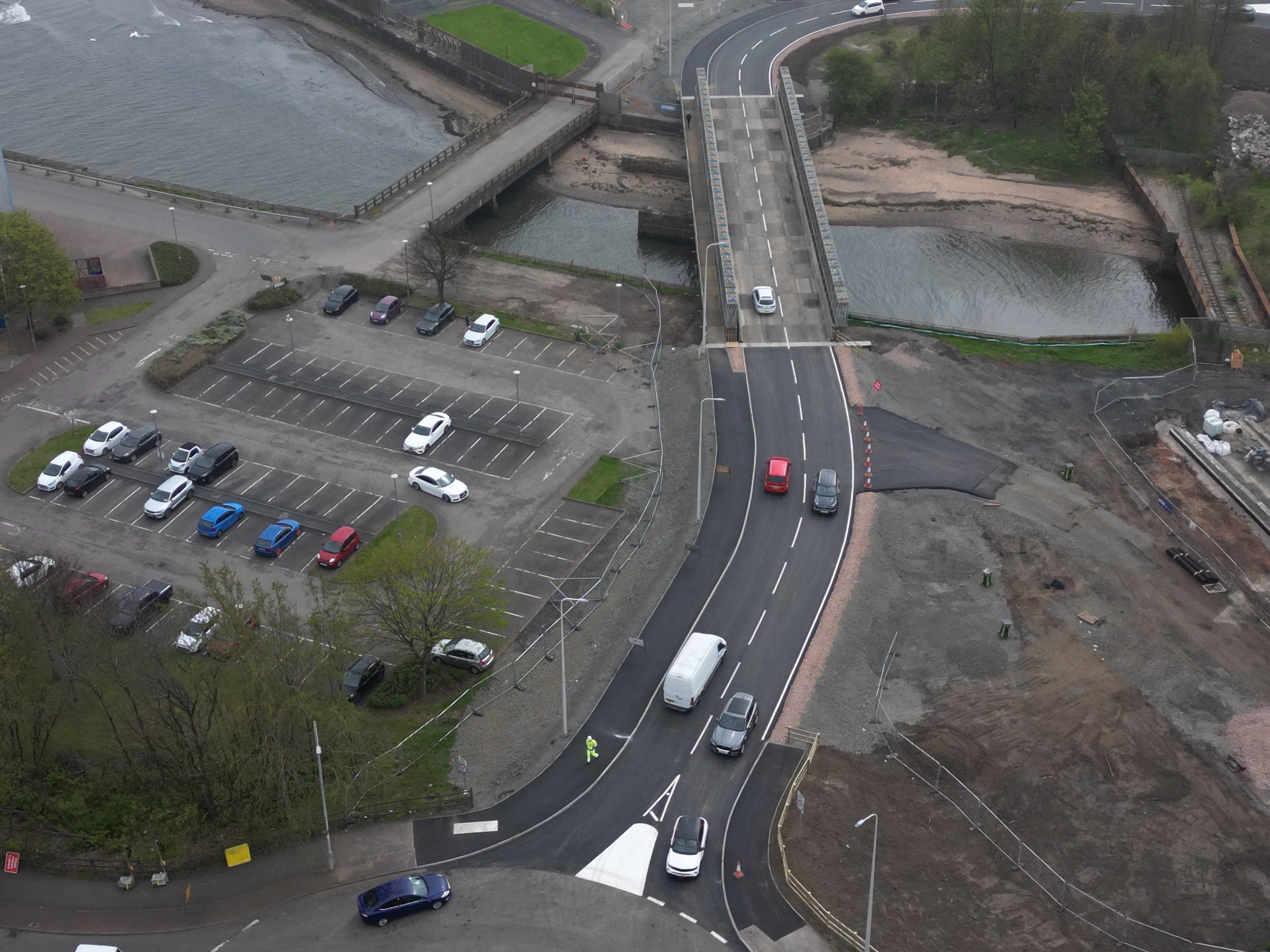The diversion route takes traffic from the A955/B933 roundabout, through the swimming pool car park and across the river via the temporary bridge. Traffic joins the existing road network at the new roundabout that has been constructed on South Street (B932).