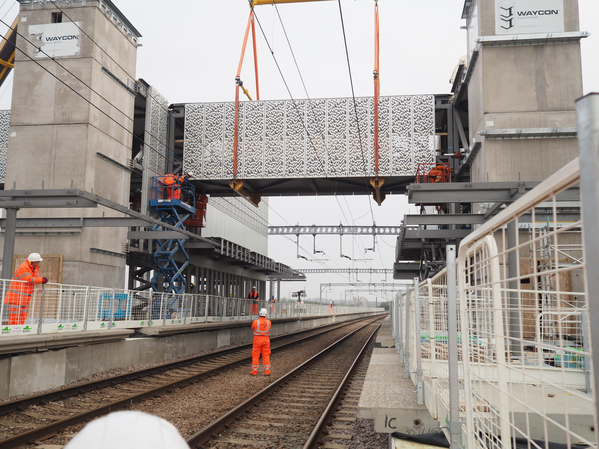 The footbridge was installed in two sections and links all three platforms to the new ticket office, lift shafts and stairwells. Each section was built on site and lifted into position last weekend.