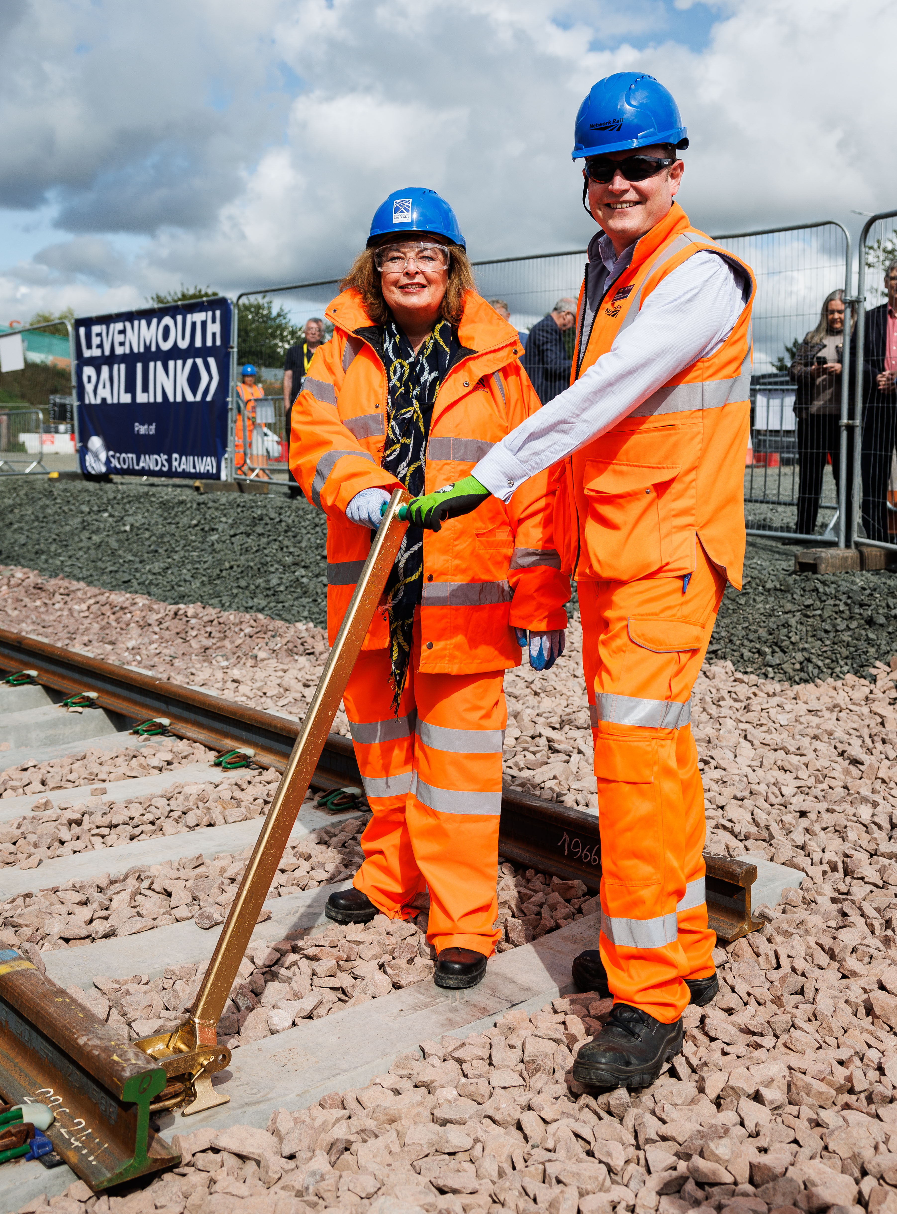 Scotland’s Transport Minister, Fiona Hyslop, has today installed the final pandrol clip to mark completion of track laying on the Levenmouth Rail Link project.